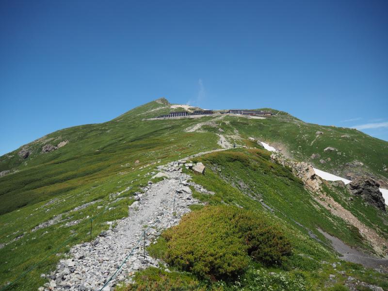 雪渓終了点から村営頂上宿舎:最初は足場の悪い崩れ気味の岩場が続くので注意。だんだんとお花畑が広がっていくので周りに気を取られないように。最後の方は石の階段が続く。