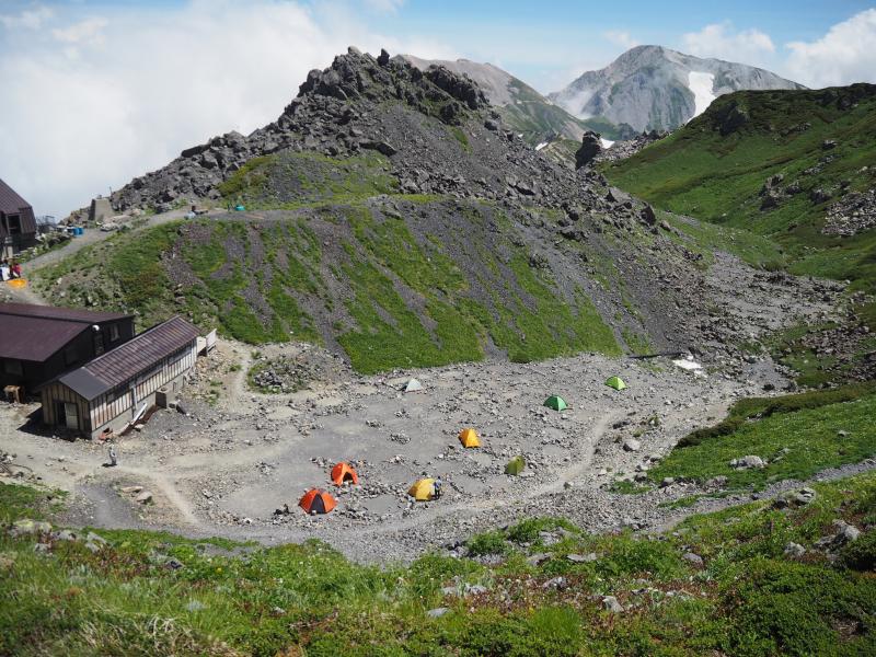 唐松山荘のテント場は山の斜面に沿って作られている。なので到着が遅ければんどん下の方へ、山荘から離れることになる。トイレは山荘の中、水場は無く山荘で買う必要があるのでできるだけ山荘近くに陣取りたい。ちなみに我々は山荘まで約5分登った・・・。テント場からはどどーーんと正面に剱・立山連峰が見える。山荘がもっと近ければ極上のテン場なのになぁ、、、