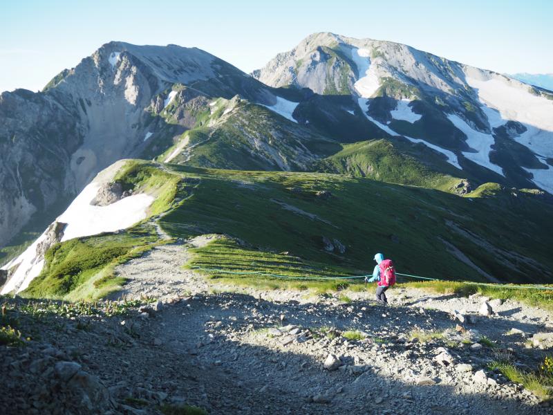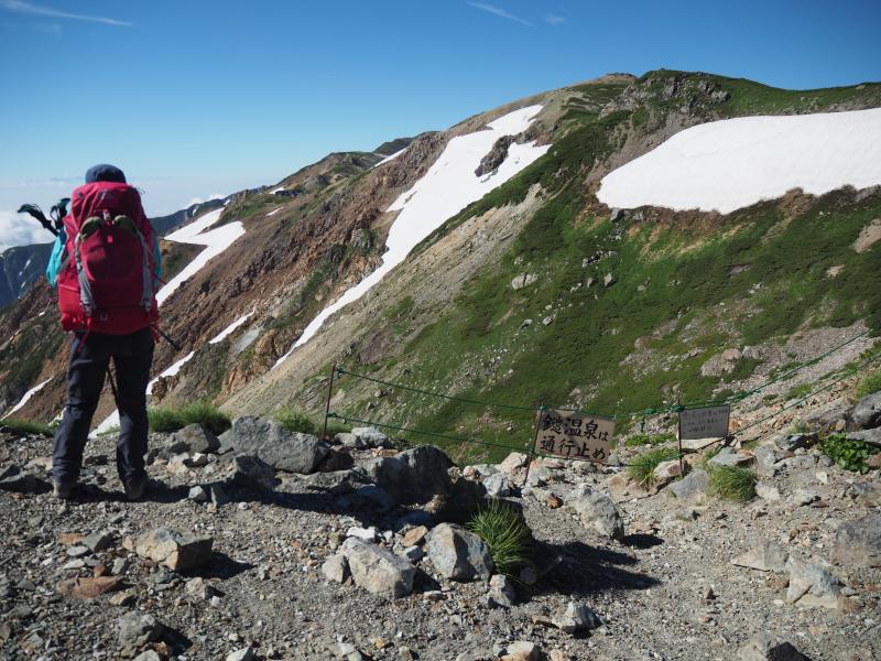 唐松山荘から丸山ケルン:最初の下り始めが急で切れ落ちた尾根歩きになり注意が必要。手すりが設置されている。すれ違いにも注意。