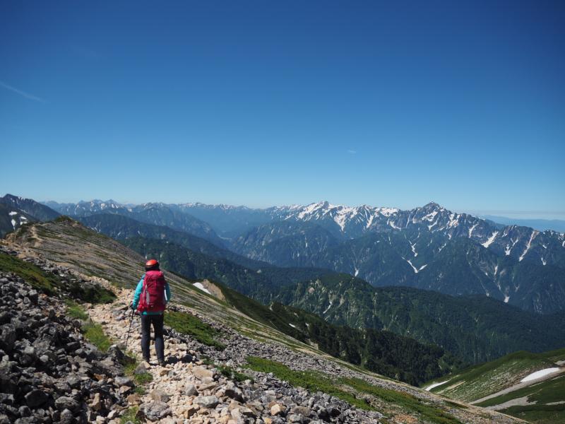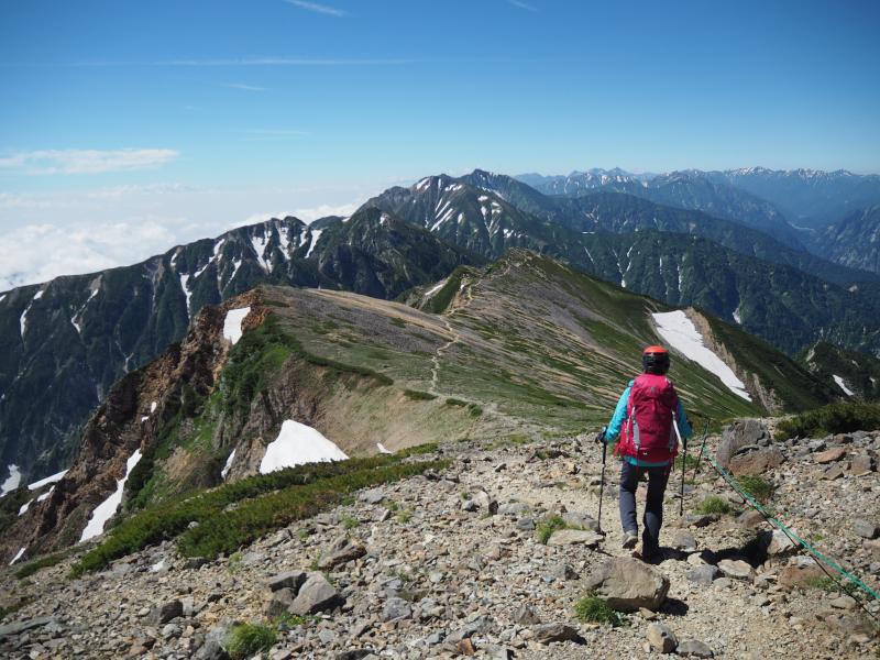 翌日も朝から空は晴れわたり右に剱・立山連峰を、正面に槍・穂高連峰を望みながら杓子岳、白馬鑓ヶ岳と進む。午前中は風が強い中の稜線歩きとなり結構寒かった。時折ウィンドブレーカーのフードまで被る始末。やれやれ。