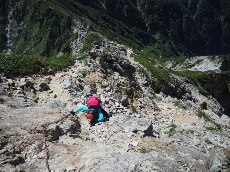 天狗山荘で休憩をした後天狗尾根を1時間ほど歩くと今日の核心ともいえた“天狗の大下り”に入る。足場の悪いかなり急なザレ場。鎖が設置されているところやしゃがんで慎重に足運びをしなくてはいけないところ、ザレたところなど嫌らしい下りが続く。