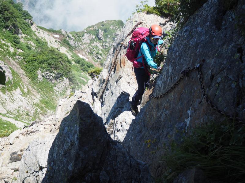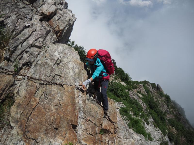 不帰ノ瞼:一峰から二峰までが鎖場が続く核心。急な斜面や、足場の悪いトラバース、鉄板を渡るなど気のぬけない場所が続くが、手足の置き場はしっかりしており三点支持で確実に進む。ヘルメット装着。