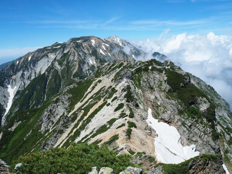 19日:村営頂上宿舎<70分>杓子岳<55分>白馬鑓ヶ岳<45分>天狗山荘<60分>天狗ノ大下り<40分>不帰キレット<30分>一峰<50分>二峰北峰<60分>唐松岳<10分>唐松岳頂上山荘テント場
