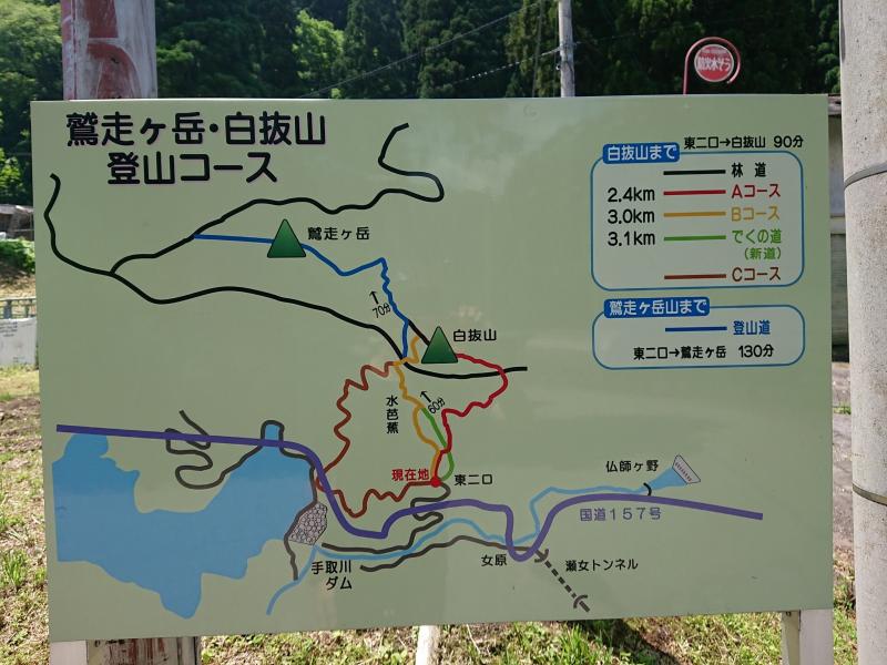 - 12:30東二口民俗資料館(10分)ABコース分岐(90分)鷲走ヶ岳(10分)林道駐車場(60分)白抜山(25分)ABコース分岐(15分)東二口民俗資料館16:25