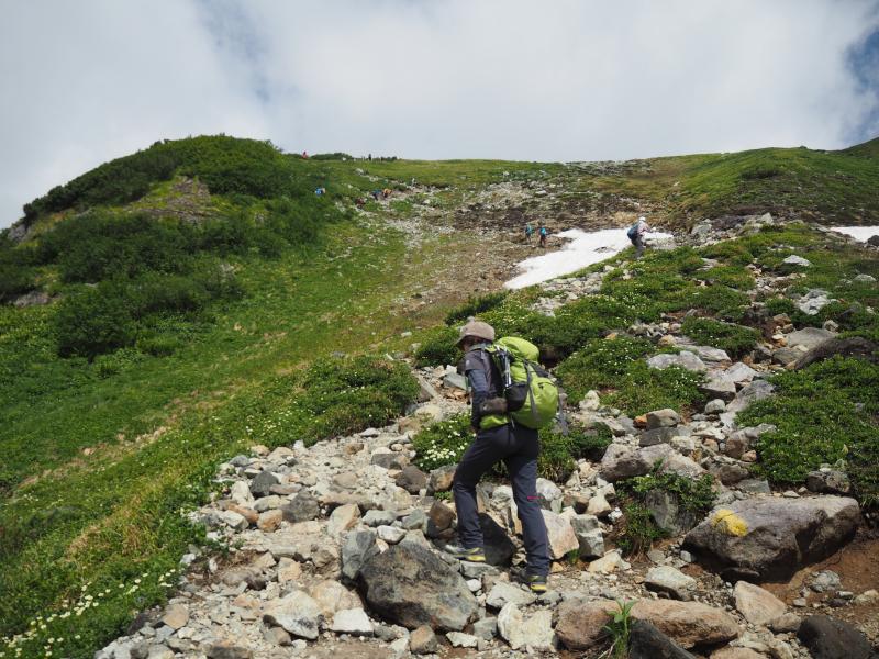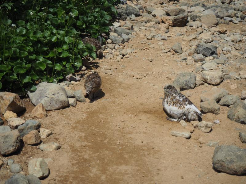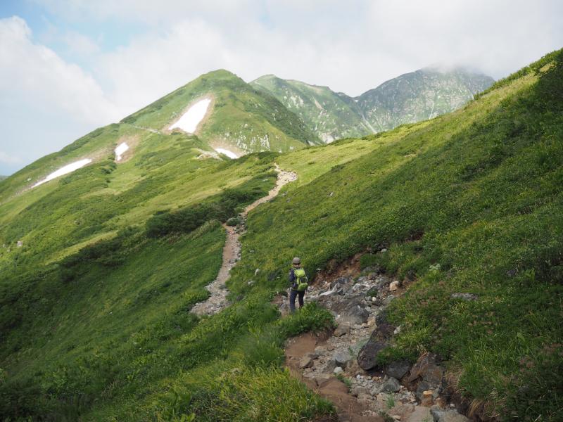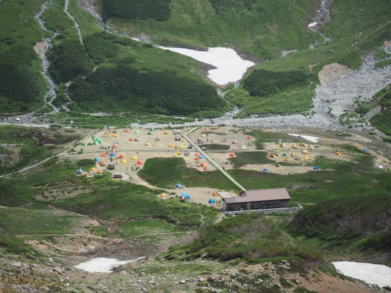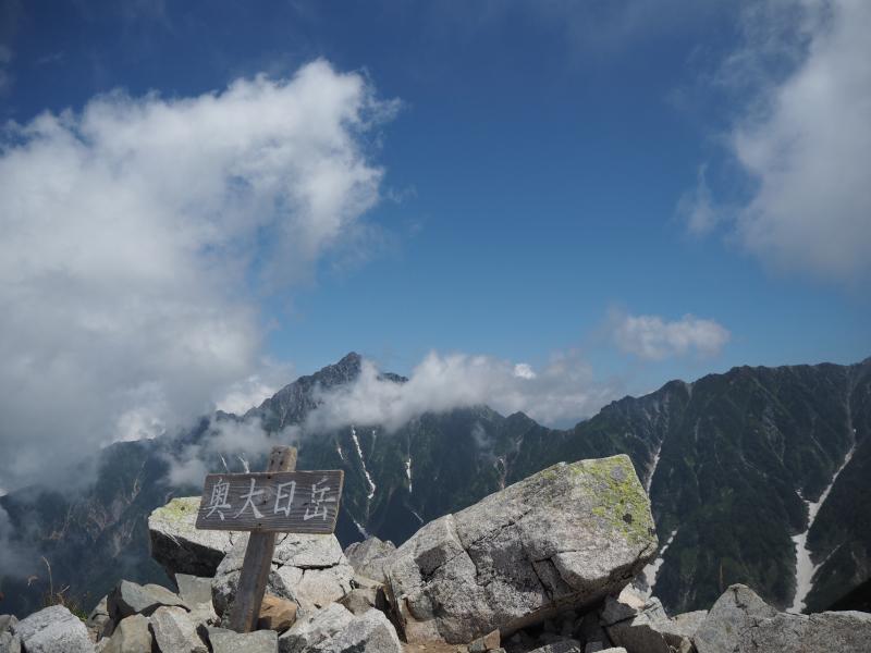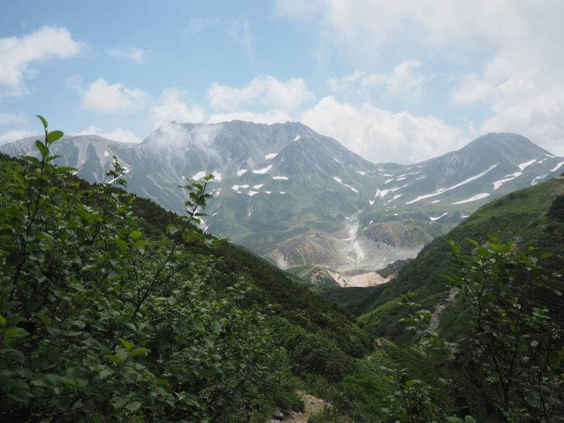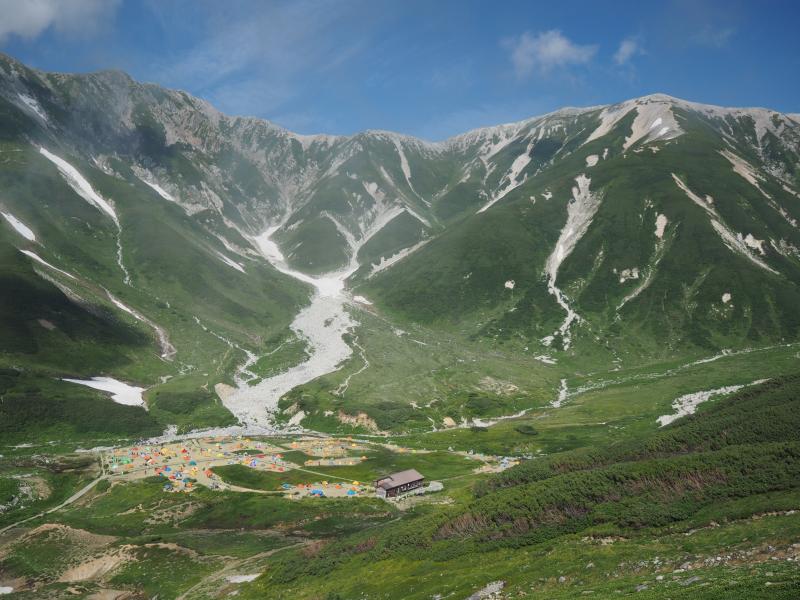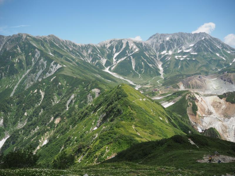 その人の波は多くが一の越方面へ進む。。私たちはテント泊装備の人や剱岳を目指しているだろう人々とまずは雷鳥沢へ。テント場にはカラフルなテントが沢山並ぶ。沢を渡るとすぐに剣御前小屋への分岐。今日はここをまっすぐ進む。ここで一気に人が減る。まっすぐ進む人はごくわずかだ。ここから新室堂乗越までは急な登りとなる。朝一番のなまったカラダに喝を入れる。乗越を過ぎると時々足場の悪い上り坂が現れるものの、だいたいが山肌をトラバースする平坦な歩き&稜線歩き。そしてふと振り返ると見事な立山三山。左側にはいつもとは違った方向からの室堂平、そしてバスの走る姿。いつもは見れない深く切れ込んだ称名川。そうこうしているうちにあっという間に奥大日岳に到着!ここのところ連続して登っているからかカラダが軽い。ペースも良いようだ。