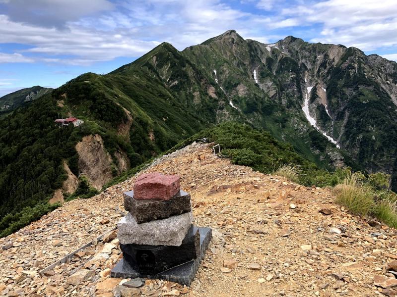 冷池山荘に荷物の一部をデポし、ヘルメットを装着して出発しました。布引山への登りが今回最大の登りで、九十九折のガラガラした道が1時間強続きます。布引山を超えれば、あとはせいぜい1時間程の登りで鹿島槍ピークへ。