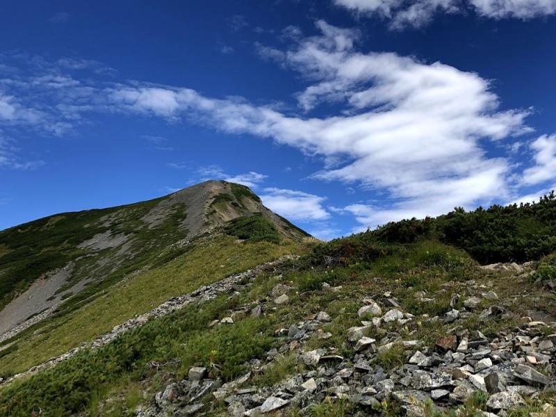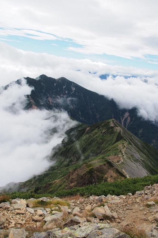 鹿島槍ピークを第一目標とし、往路は爺ヶ岳ピークを無視。稜線の西側を斜面を横切るように続く、アップダウンの少ない道を軽快に進みます。冷乗越手前が、ガラガラの登山道でやや歩きにくいです。