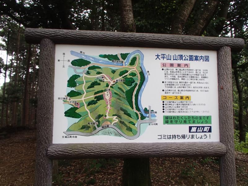 - 武蔵嵐山駅>35分>嵐山渓谷キャンプ場>20分>鎌形八幡宮>20分>嵐山渓谷>20分>大平山>10分>大平山登山口>15分>小倉城跡入口>13分>小倉城跡>60分>物見山>10分>大日山>33分>仙元山>20分>仙元山登山口>30分>小川町駅