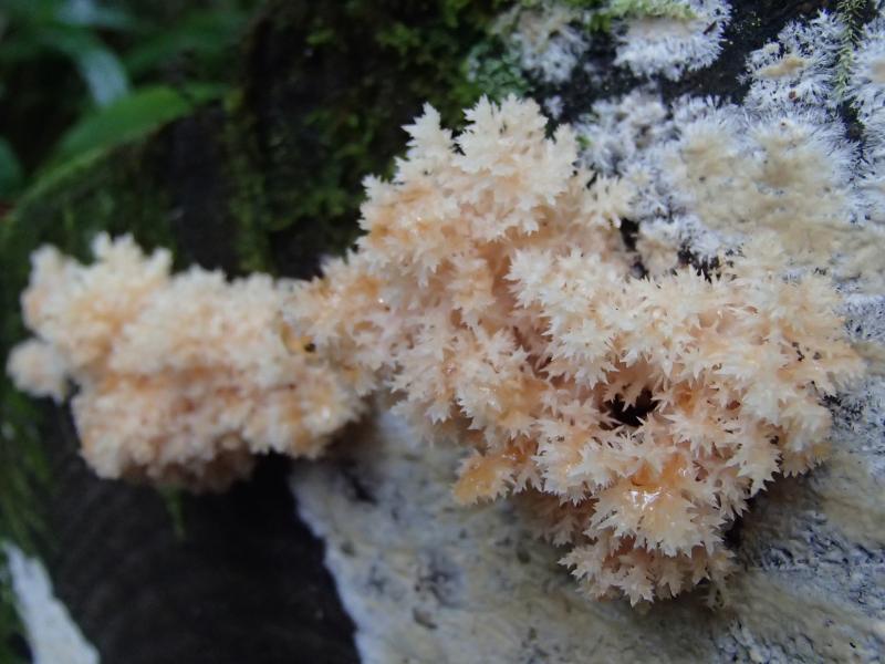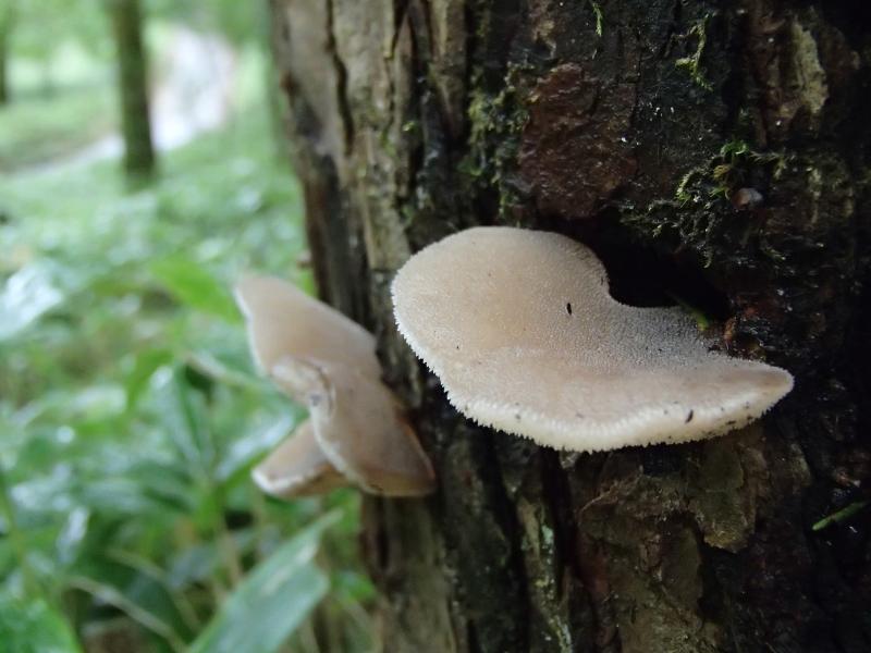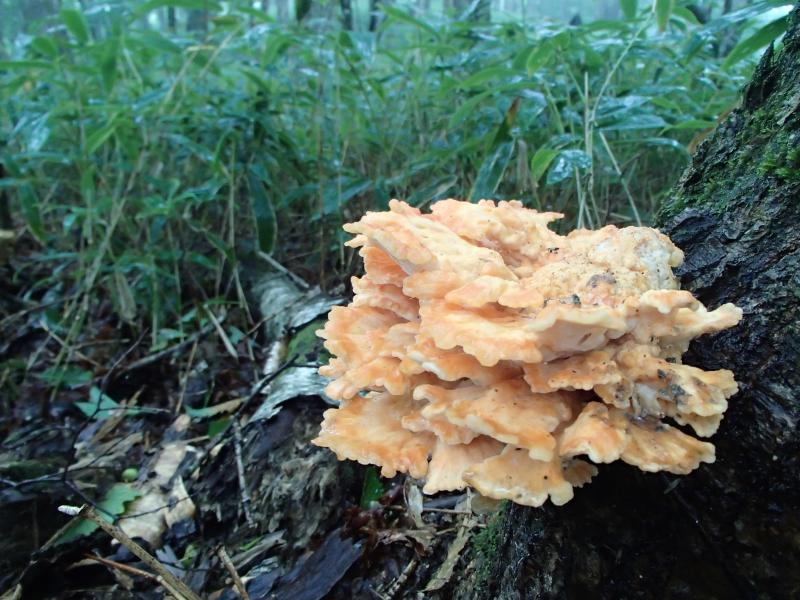 ・ダラダラ歩き、ベラベラ喋り、モグモグ食べながらゆっくり登って行くと、さすがに暑くなってきた2人が脱衣休憩。その間、遠くにある樹木にキノコを発見したので、「ムキタケか!?」と勇んで見に行くと、やっぱりツキヨタケ・・・。ですよね。