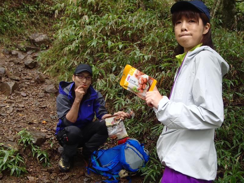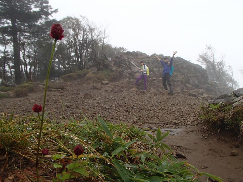 ・山頂手前で殆ど雨は上がり、山頂で足立の淹れてくれたコーヒーで暖まります。記念に写真を撮ろうとすると、三脚をセッティングし終えた女帝が昨日に引き続き「ひょっこりさん!」。(・・・、たぶん「ひょっこりはん」やろうな~と思いながらスルー)。