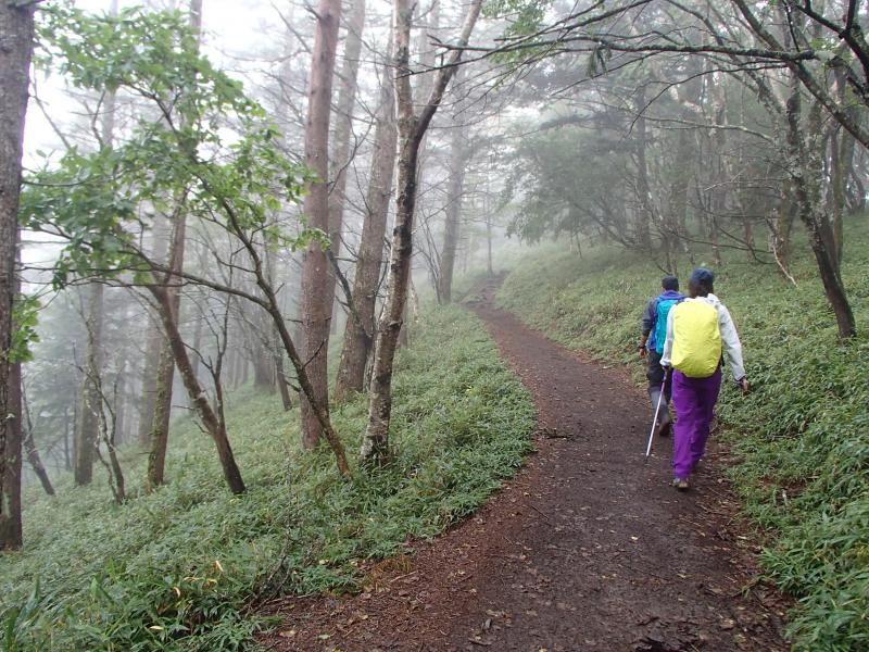 ・笑顔で道の駅を出て登山口へ向かっていくと、まさに雲の中に突っ込んで行く状況。視界が悪くなってきたと思ったら、本降りの☂・・・。