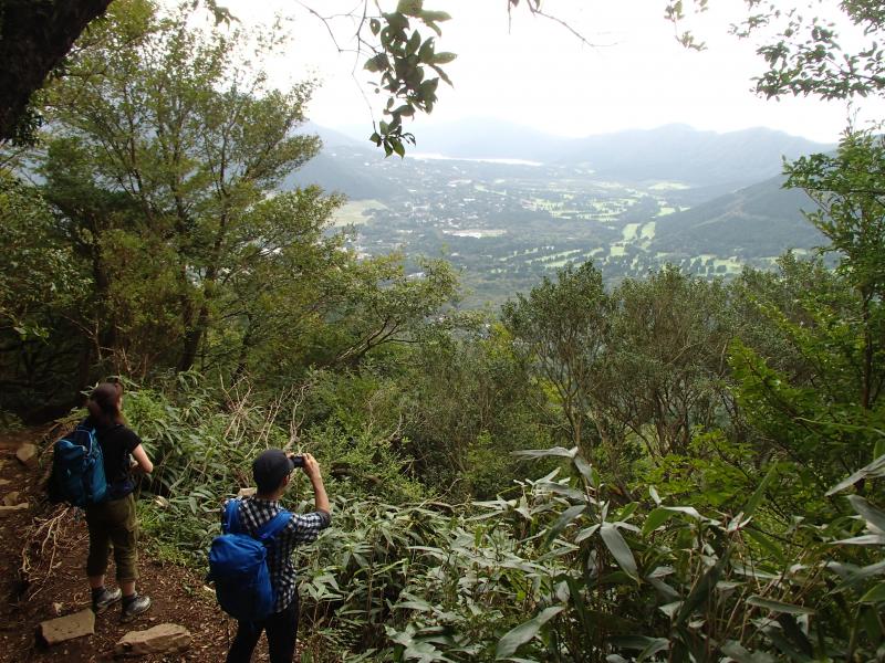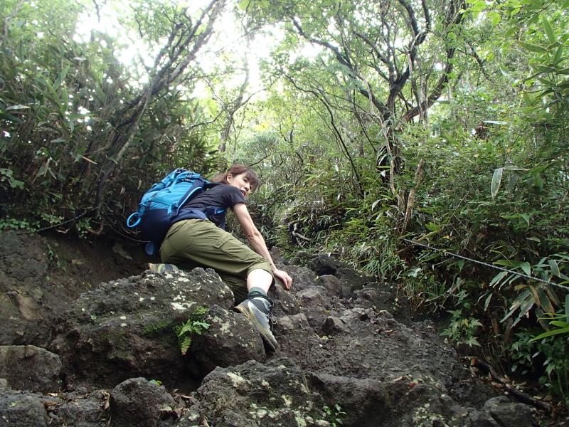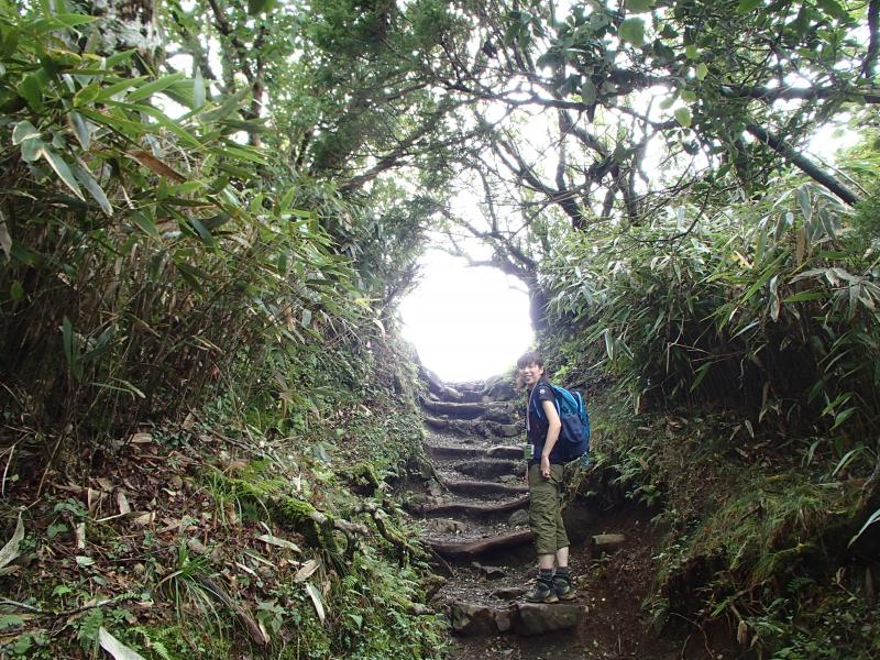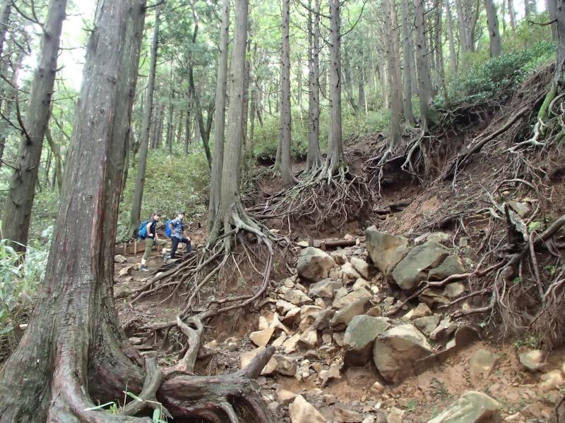 ・根がむき出しの木々が並ぶ一種異様とも感じられる場所を抜けると、徐々に展望が得られるようになり、気分も明るくなって会話も弾んでいきます。が、頭上にはどんよりと雲が広がり不安も広がっていく。
