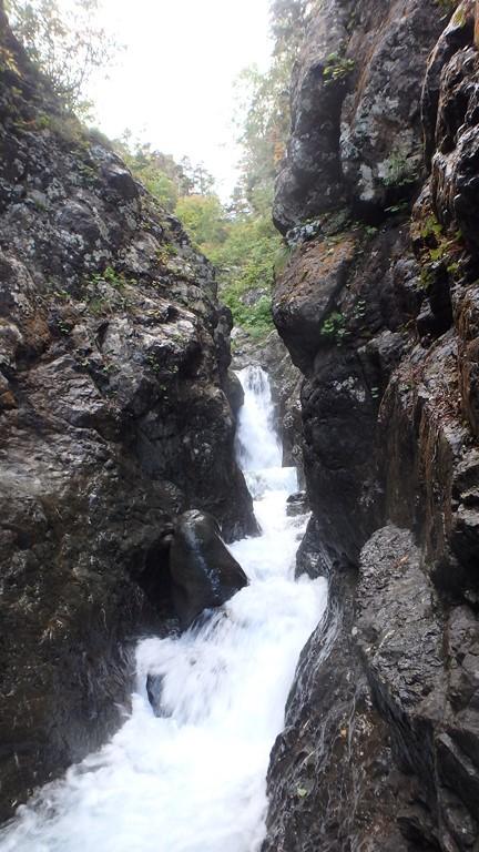F9を抜ければ4~5個ほどの小滝のみだが意外と侮れない。上二俣を右手に入ると薄い藪こぎで夫婦岩の南峰と北峰のコルに出る。