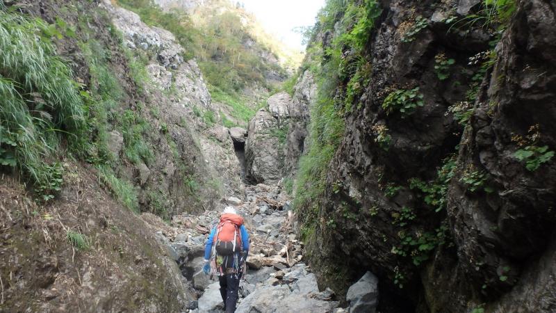 初日は旧道からユーフレ小屋まで。小屋前で焚き火をしてのんびりと過ごしました。翌日5時半に出発。本谷の穏やかな流れからやがて通過できないゴルジュが現れます。ここは左岸から巻きますが、ちょっとイヤラシイ巻きで早くもロープを出します。ここを越えて少し歩くとガンマルンゼ出合いに辿り付きます。