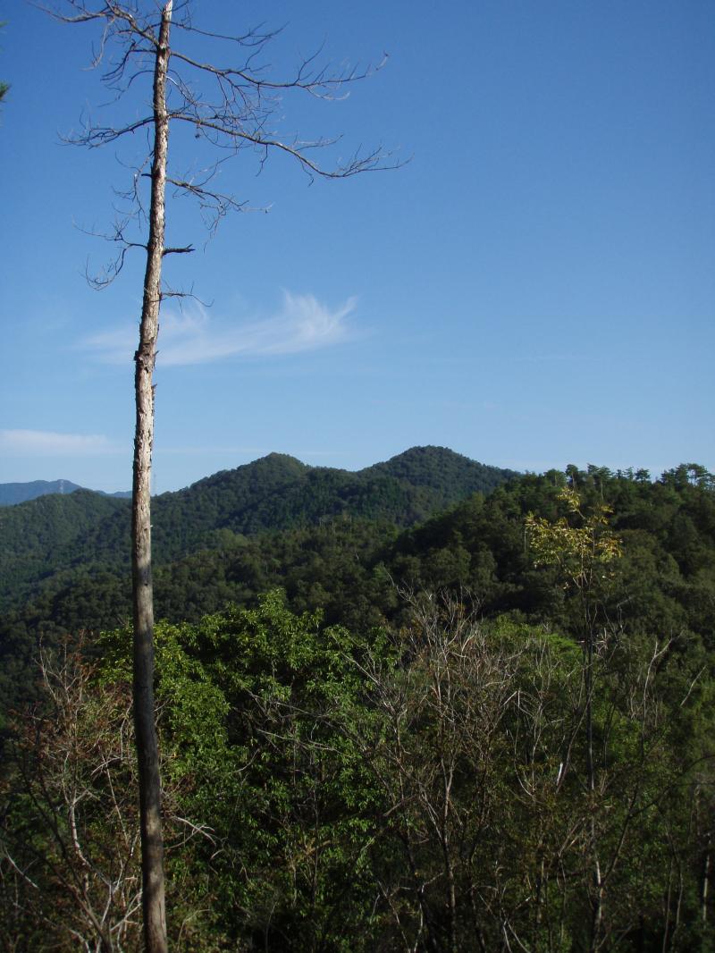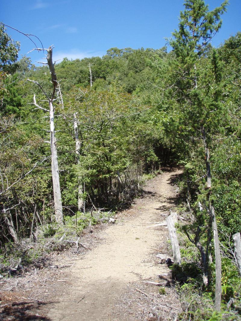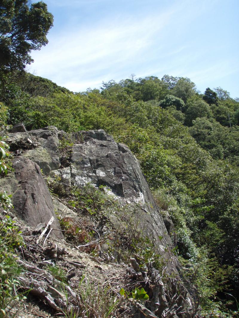 山頂から先は風通しが良くなり、道幅も広くなって植物のトゲに引っ掛かる事もなく、蜘蛛の巣も少なくなって快適な縦走を楽しめます。30分ちょっとで「東ののぞき」に到着。修験者が修行で使用したのか錆びた鎖が残置されたままでした。