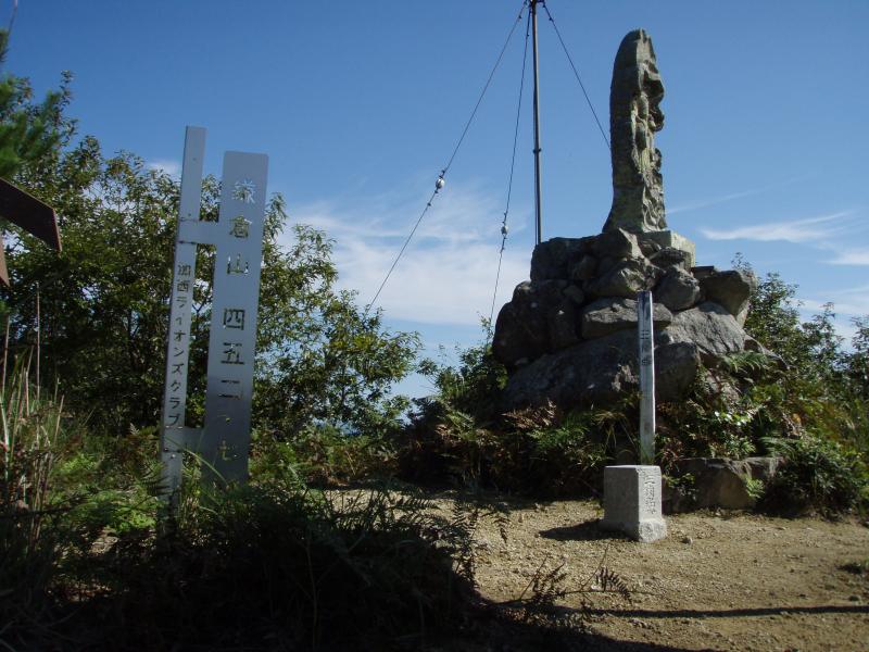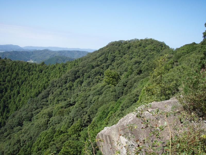 河内城跡から先は所々密生した植物に行く手を阻まれ、夥しい数の蜘蛛の巣を振り払い、急斜面の激登を越えて、鎌倉山の山頂に到着。三角点あり、展望あり。気温24度で蒸し暑い。山頂から片道5分ほどの所にある「西ののぞき」は危険な為かロープで囲われていました。