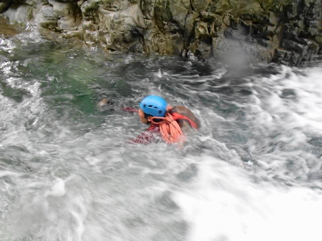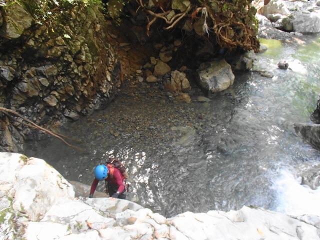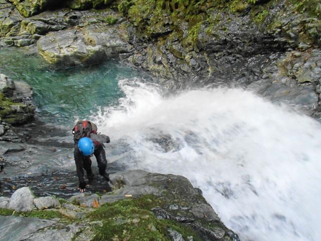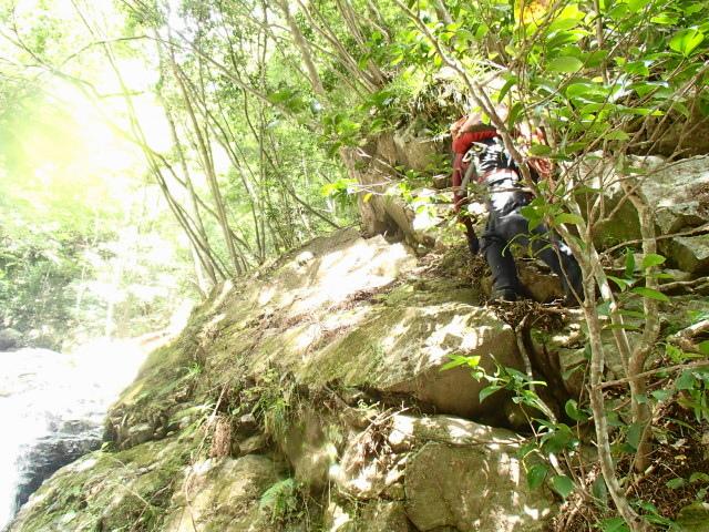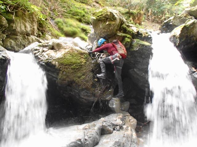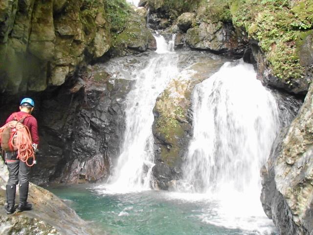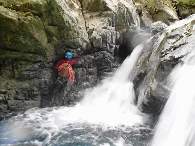 今回は少し水が冷たそうだったのでアンダーにミレーのメッシュアンダーとファイントラックのフラッドラッシュ、バーグハウスのシェルで登りました。へつりに失敗して滝つぼに落ちても冷たく感じませんでした。