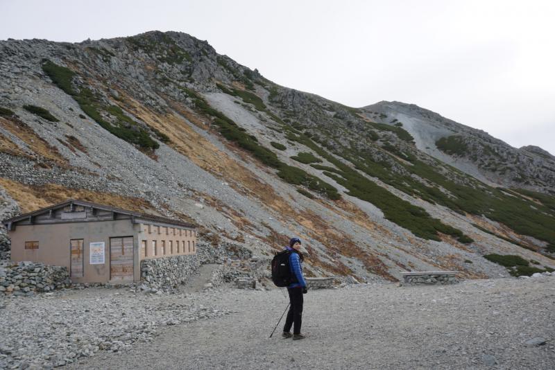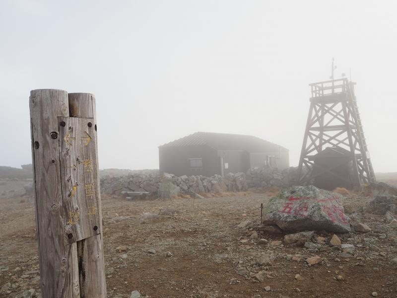 ガスガスの中ぼんやりと「ここら辺かな?」とやり過ごし、一ノ越山荘の手前でようやく少し晴れ間が見えてきました。