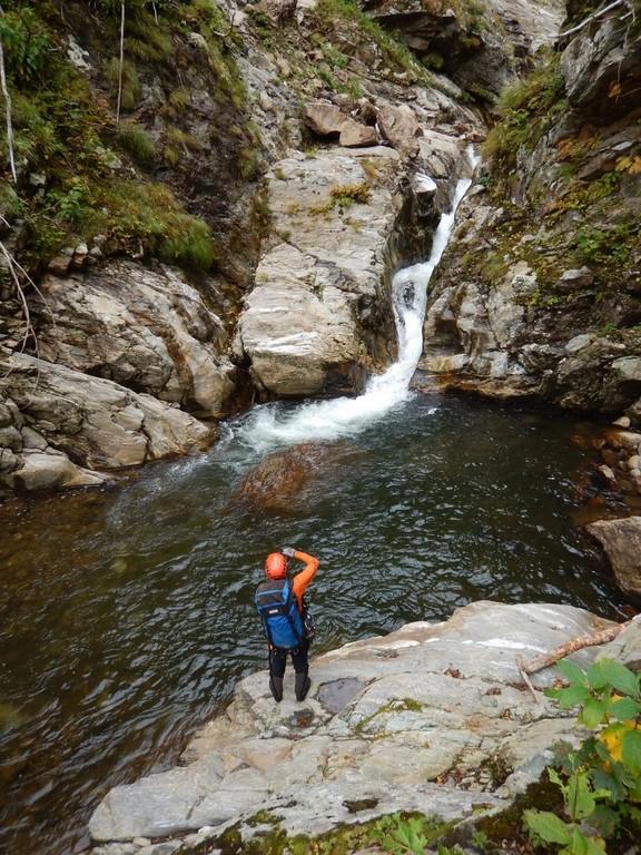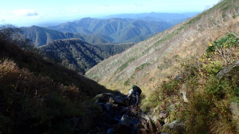 中ノ岳から下降で使用。稜線からの下降ポイントの上手く選択するのが重要。稜線をしばらく南下してからが良い。早いと猛烈な笹薮をしばらくこぐことになる。懸垂が必要な滝が1,2個あるほどでさほどこんなんではなし。700m二股から下部はガレに埋まる。