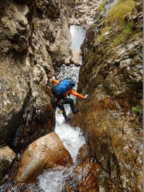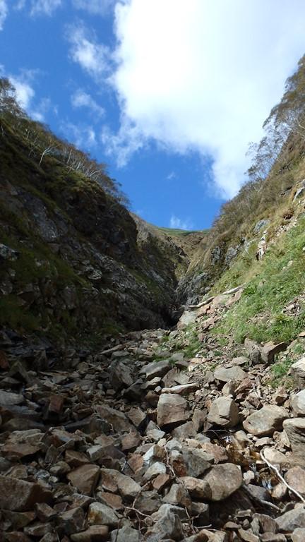 ペテガリ岳からの下降で使用。上部所々がれているので落石に注意。大きな滝も多く、クライムダウンを慎重に。パーティによっては懸垂下降の連続になる。スケールも大きく、ペテガリ沢川の各支流の中でもおすすめの谷。