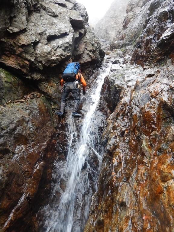 別名『函沢』と呼ばれるほど函、ゴルジュが長い沢。出合い10分ほどで釜を持った直瀑F1から長い核心部が始まる。屈曲点ごとに手ごわい滝が多く、高巻きのライン取りも重要。今回は610m二股後に大きな雪渓があり、この処理に時間が掛かった。テン場は670m付近。810m付近の大滝はその上の滝も含めて左岸から大高巻き。難しくはないが高度感抜群。その後は頂上付近まで快適な滝が延々と続く。