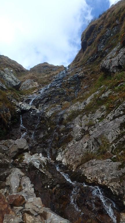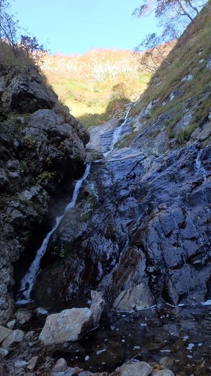 水量は少なく、880mから1100付近までと核心部は短いがなかなか侮れない滝が多い。ツルッとした岩盤状の滝は登りづらく緊張する高巻き箇所も。時期が早いと雪渓処理も必要となるはず。上部はガレで藪こぎなく中ノ岳西側のコルに出る。