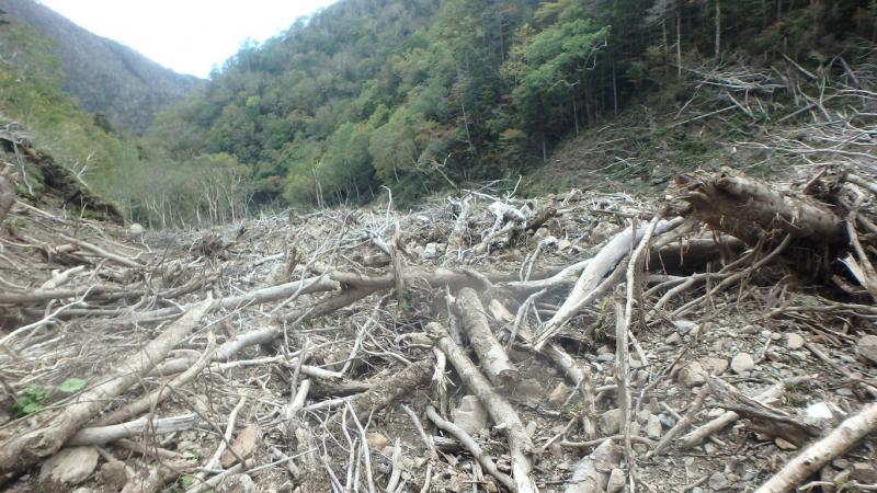 今年の台風なのか、2016年の台風の影響か不明だか、今回歩いたサッシビチャリ、ペテガリ沢川、ニシュオマナイ川ともに下流部は大きく崩れ、ガレや土砂、倒木で埋め尽くされている箇所が目に付いた。特にペテガリ沢のA沢出合いから中ノ岳北面直登沢出合いの間はかつての渓相の面影が全くないといって言い程。