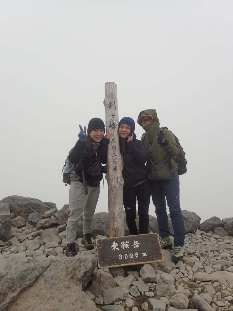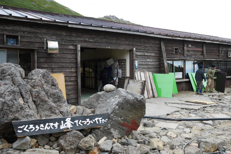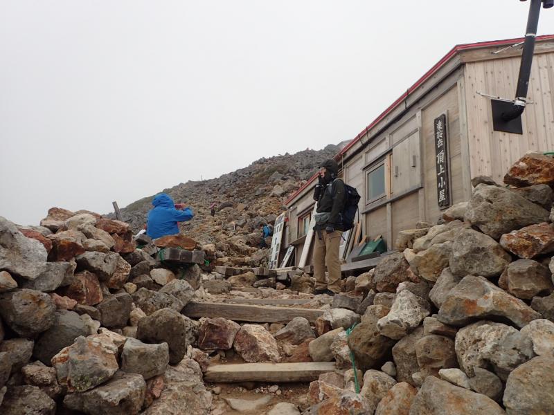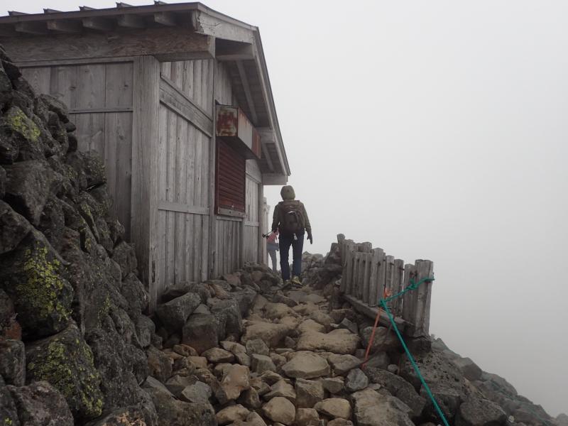 山頂を踏む頃にはかなり雲行きが怪しくなってきたので、頂上小屋でピンバッチなどを購入したらすぐに下山したのですが、風が強くかなり寒く、グローブを持ってこなかった平木は辛そう。神対応の吉岡さんがグローブを貸してあげて持ち直したが、肩ノ小屋に着いたときには学校のプールで冷えた子供みたいな表情になっていた。