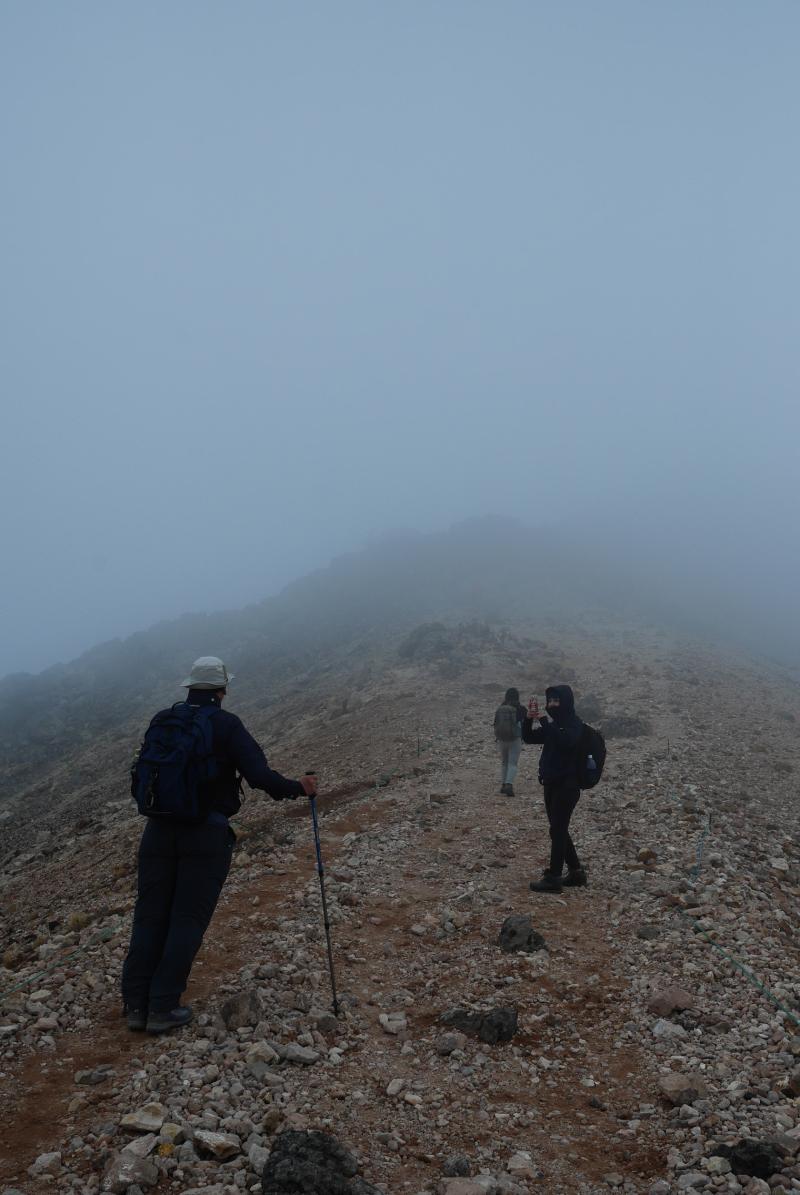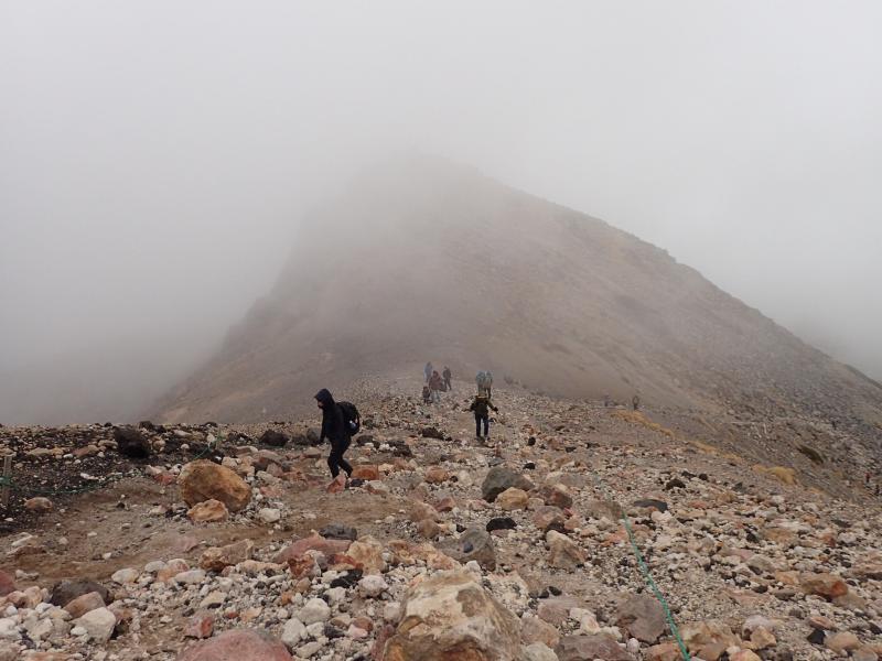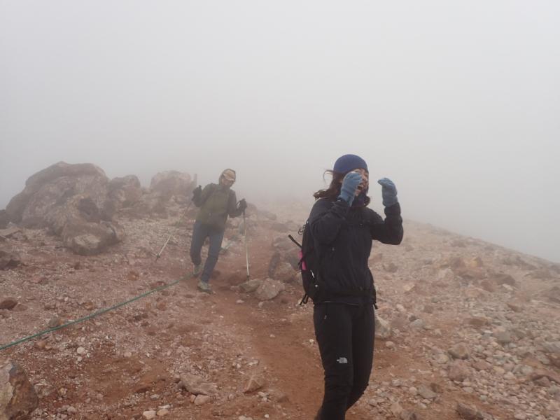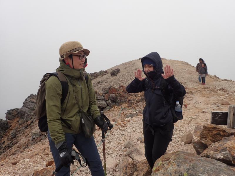確かにミドルカットでも登れる山だけどあまり軽装だとこの時期危険です。稜線上まで出るとかなりの強風とガスで視界も不明瞭となり、バテたわたしはだいぶ遅れて歩いていたのですが、それに気がつかずにスマホで動画を撮っていた平木は、ずっとわたしだと勘違いして後ろにいたおじさんを撮影していました。風が突風になってあまりに寒くなったので「超さむーい!」と振り向きざまにわたしに話しかけようとした平木は、「ほんとに寒いねっ!」とやはり知らないおじさんに答えられていました。いい人でよかったな。