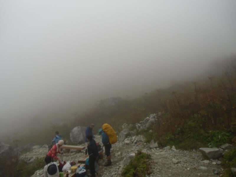 鏡平から槍穂が見えてくるはずなのだけど、ずっと曇って見えまへん。
