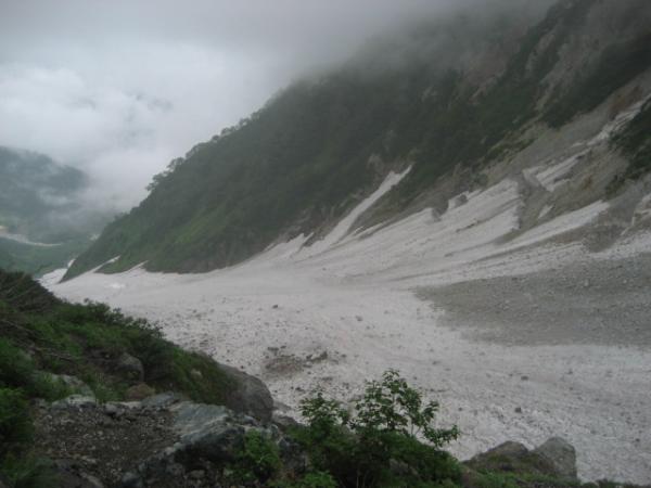 雪渓では立ち止ったりせず、上方に常に気を配りながら歩きましょう。