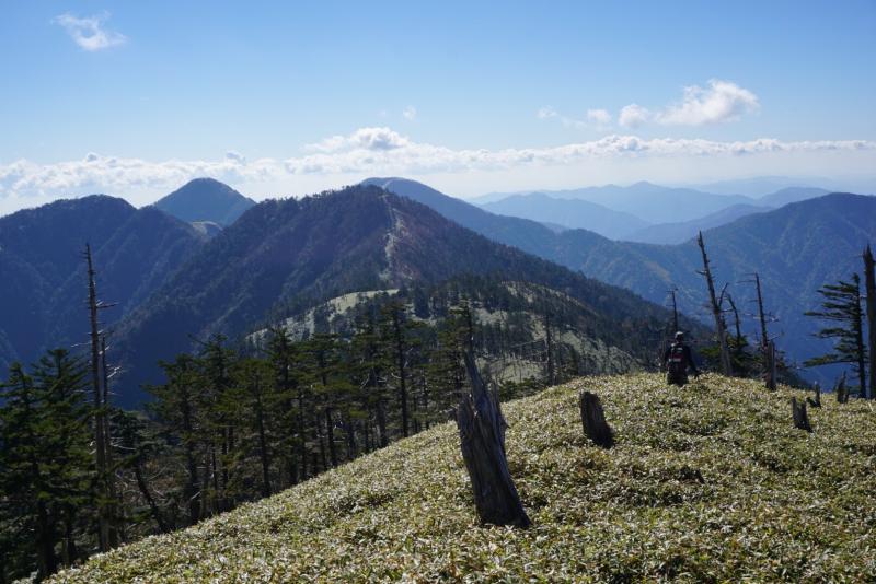ただ、今回は天候には非常に恵まれました。二日間通して好天で、露営した六呂場山頂上付近も風がほとんどなく、寒くもなく快適に一晩過ごせました。日中も気温は高めでした。尾根上や不動岳山頂からは、聖岳や光岳などの百名山、中ノ尾根山や黒沢山や黒法師岳など、その他の深南部の山々など多くの山が見渡せ、普段は見れないような絶景を拝むことができました。月並みですが、今までの苦労が報われたような、そんな達成感に浸る自分がおりました。