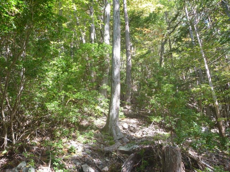 鎌崩ノ頭からの下りも、油断は禁物です。元々、所々踏み跡が薄い箇所がある上に、9月末の台風の影響でしょうか、巨木が何本も倒れていて、それらを苦労して乗り越えるたびに、踏み跡や赤テープを見失います。下部は尾根もはっきりしなくなってくるので、現在地が分かっている限り、方向を確認しながら下るべきでしょう。