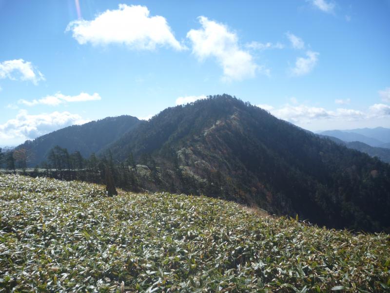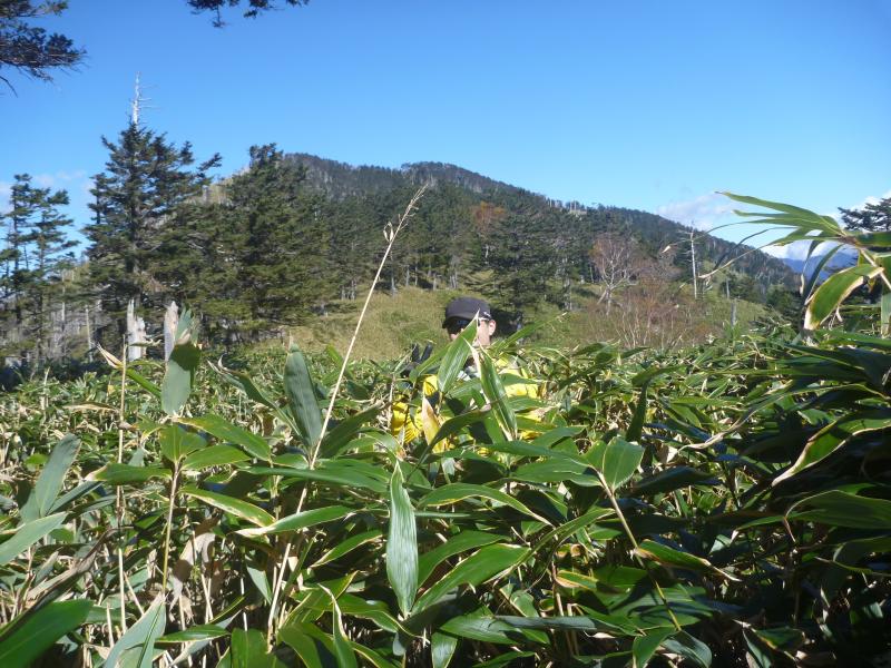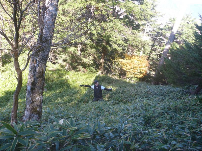 南アルプス深南部は、笹(クマザサ)が深いことで知られています。鹿ノ平周辺は、その中でも上位に入る笹の深いエリアです。案の定、1799mピーク付近から笹が現れ始め、下って鞍部を過ぎると、背丈を越すくらいの笹エリアになってきました。踏み跡もほとんどなく、密集する笹が体や荷物にまとわりついて行動の自由を奪われ、しかも、これまた登り返しの急登で、笹を踏むと足も滑り、進むのにかなり難儀します。ストックは笹に絡まってあまり役に立たないので、ザックに仕舞い、笹を掴みながらの方が、多少ラクに登れるでしょう。また、笹で目をやられないよう、注意が必要です。