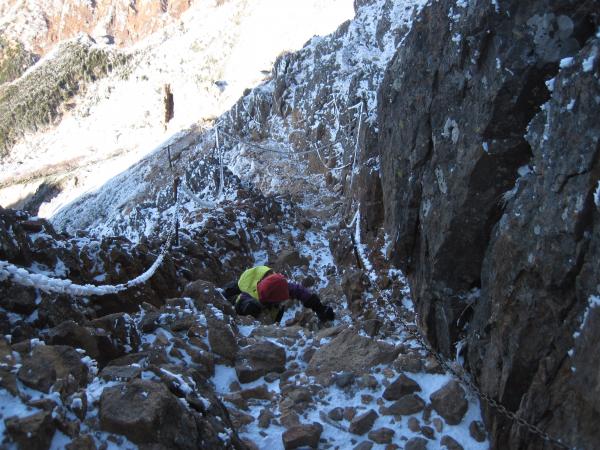 横岳からはハシゴを下りたり、カニの横ばいと呼ばれるクサリ場を通過したりと変化に富んでいて楽しく歩けます。