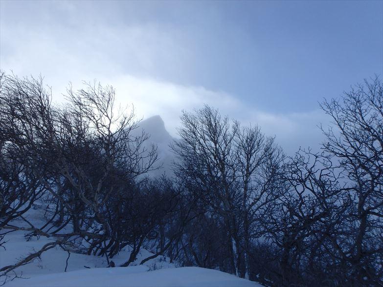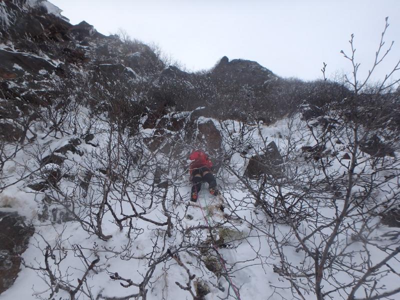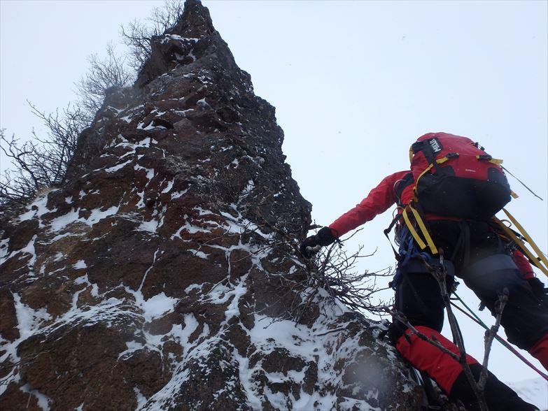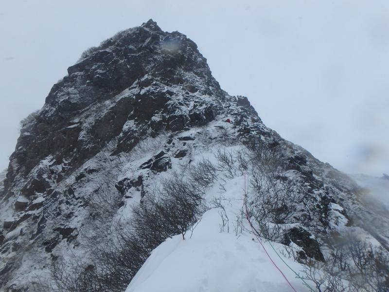 夜半から風はおさまあり、二日目は曇り空ながらコンディションは良好。ただしかなり寒い・・・。1750mの肩付近から急なトラバースを経て北稜に取り付きます。北稜は雪つきが少なく半分以上岩が露出したドライコンディション。木登りのように薮を掴みながら登る箇所もあります。今回は3人でジャンケンしてリードを担当しました。3級程度のグレードですが意外と登りごたえもあり楽しむことができました。
