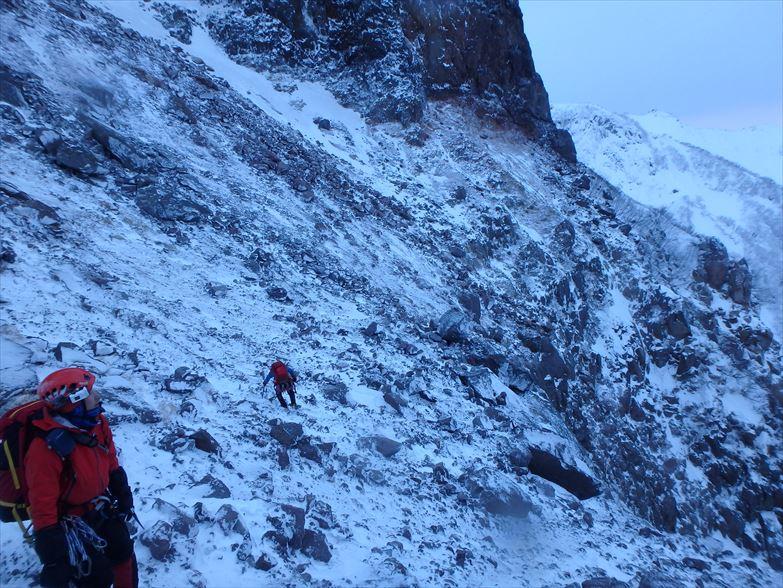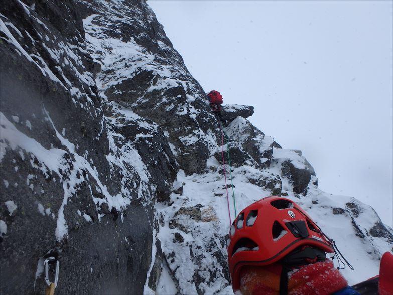 北稜も雪が少なめでドライセクション多め。場所によってはダブルアックスよりも岩を掴みながら
