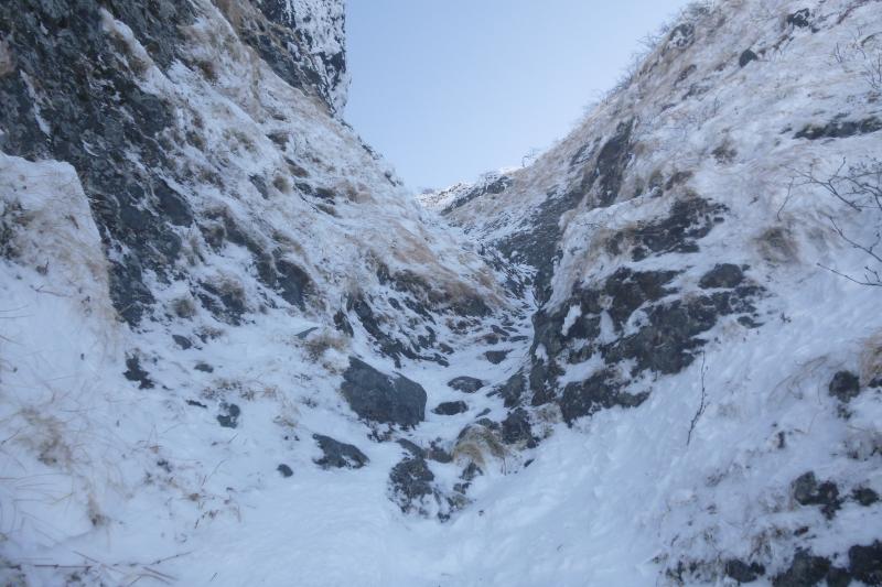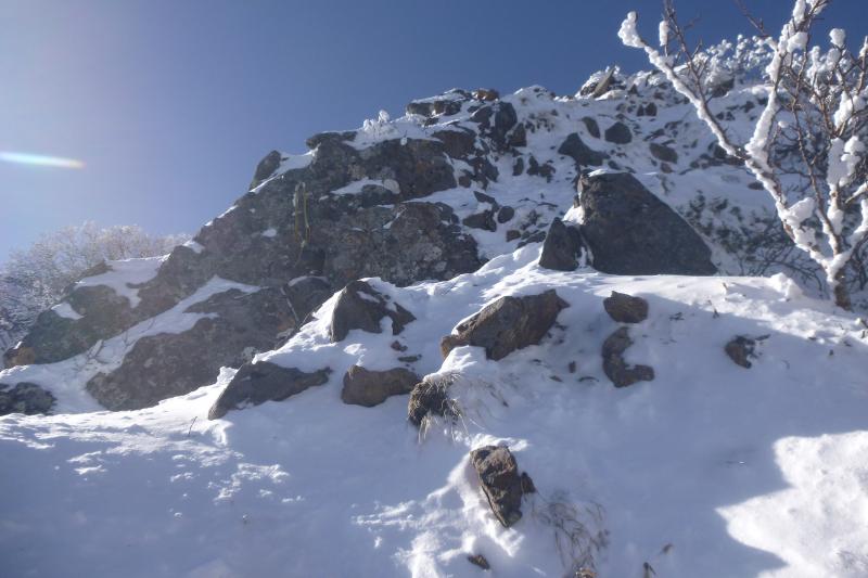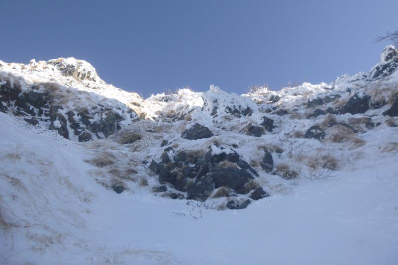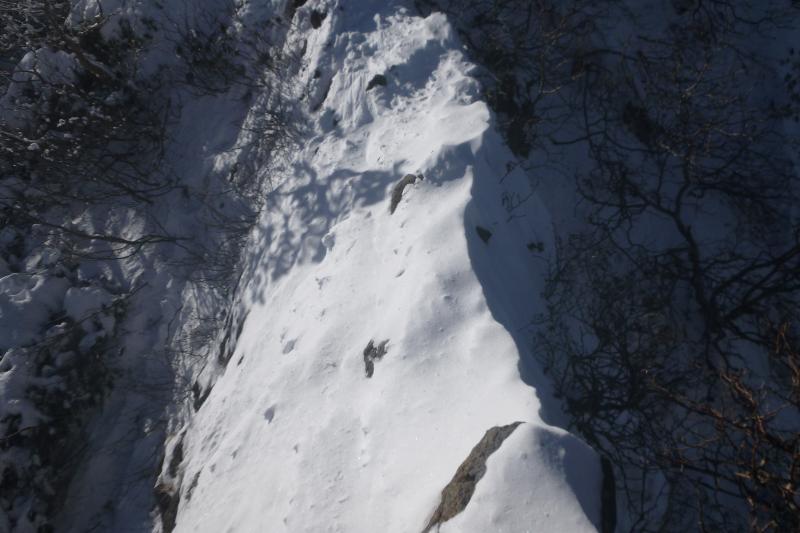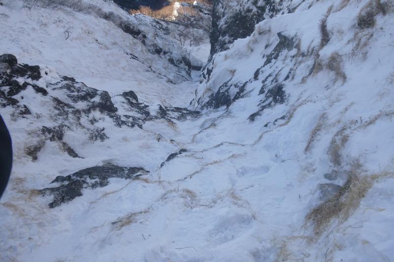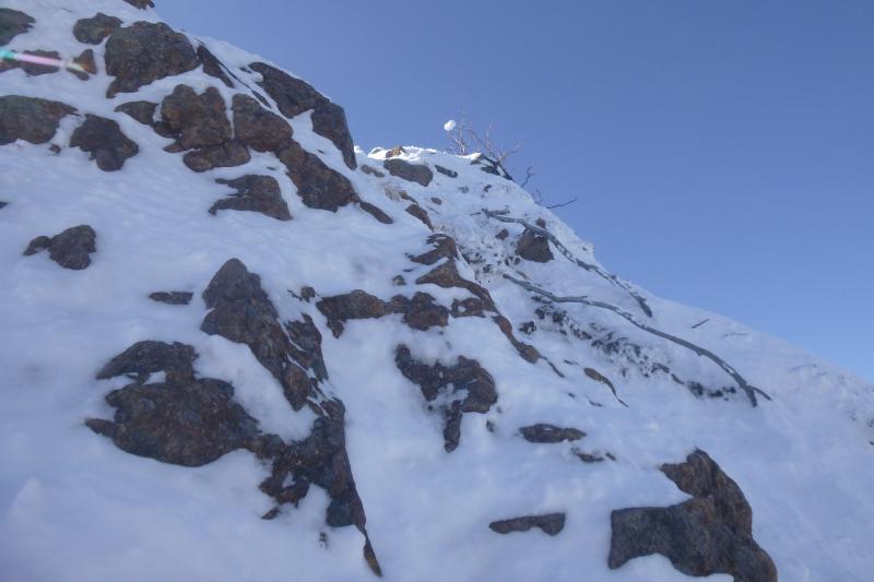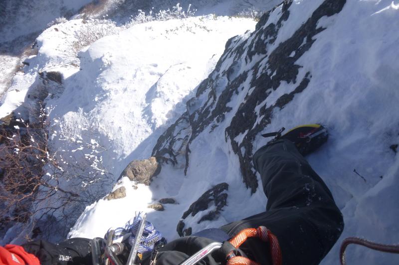 南稜よりも岩登りの要素が強いですが、岩は雪で埋まってなければ基本的にガバや草付などホールドはあるのでシングルアックスで問題ありませんでした。