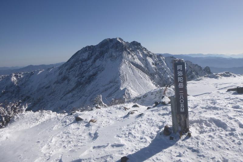 - 舟山十字路(5:40)~南稜P3(9:30)~阿弥陀岳山頂(10:20)~北稜第一岸壁(11:15)~阿弥陀岳山頂(11:50)~御小屋尾根経由 舟山十字路(14:00)