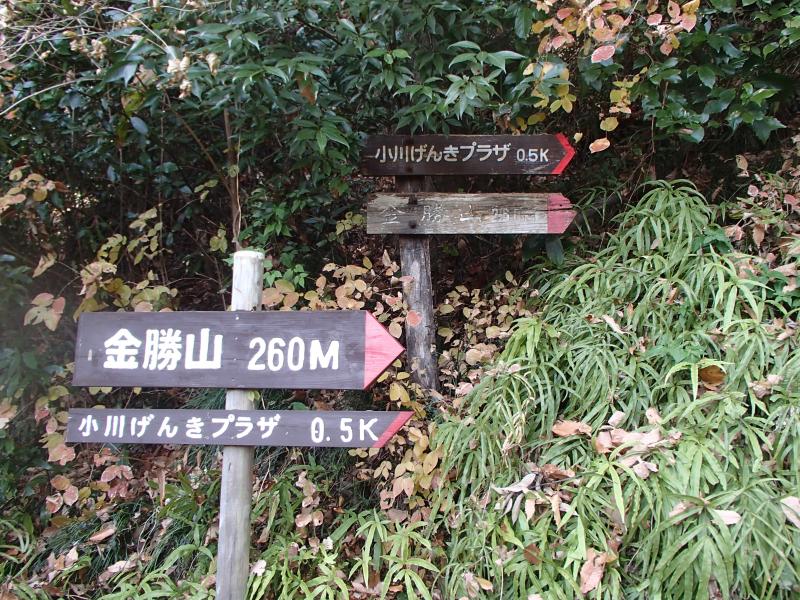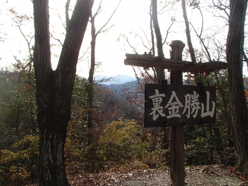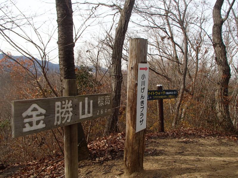 ・足早に歩くと20分足らずで山頂に着きます。低山ながら展望は抜群!手前に見える山並みの向こうに雪を纏った山々が見え、思わずのんびりしてしまいました。山頂を後にし、1分ほどで山頂より立派な管板を配した「裏金勝山」、更に1分で「小川げんき村」に到着します。