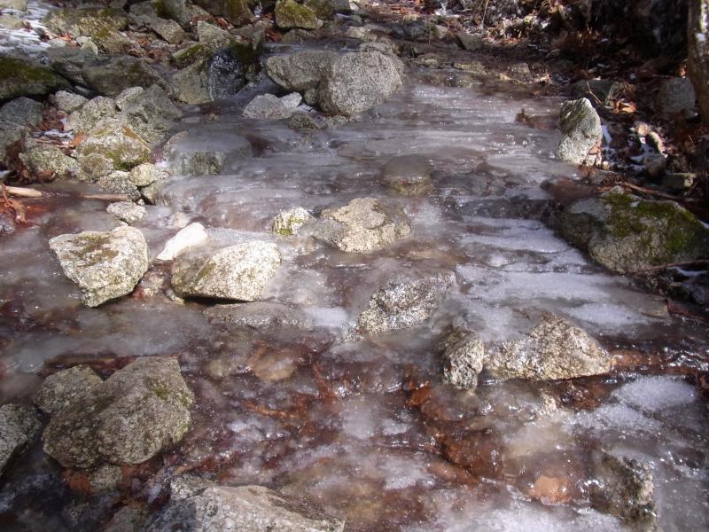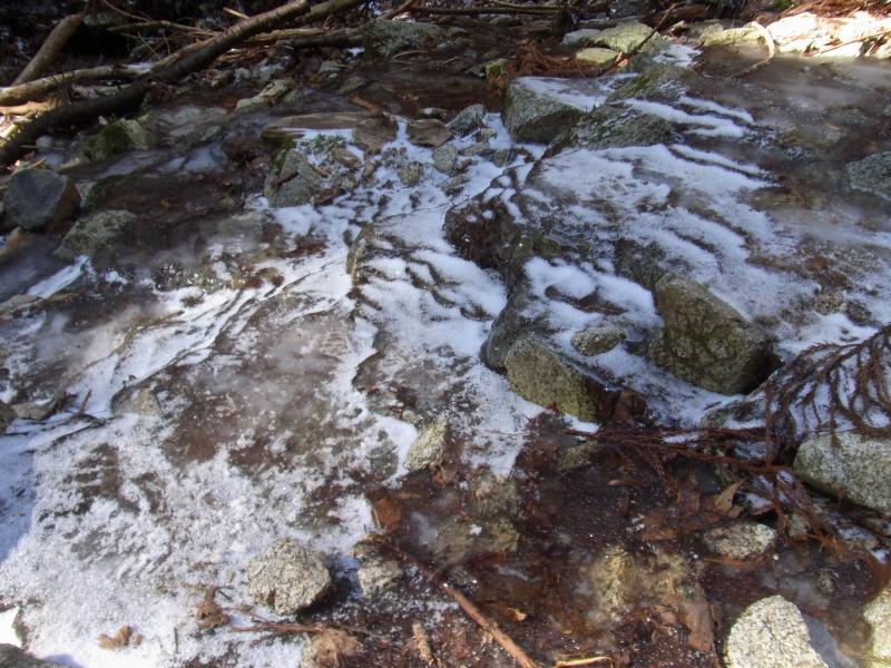 滑らないように足元をしっかり見て、そろそろ滑り止めや軽アイゼンなどの用意が必要です。