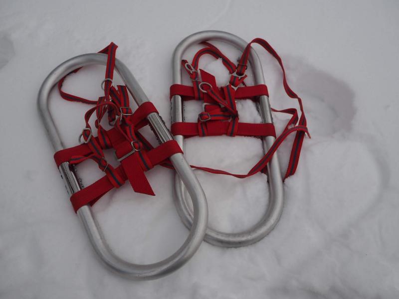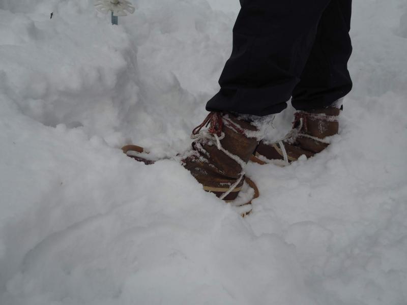 スタート地点の竜山ゲレンデの駐車場でワカンを着用してください。