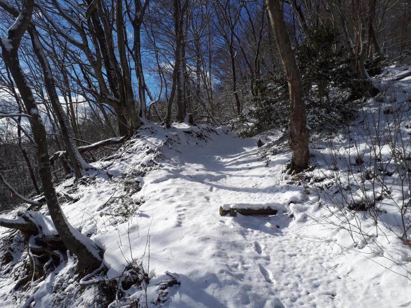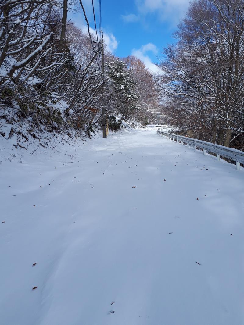 - 林道合流地点の手前あたりから少々積雪あるが、すぐに溶けてしまいそう。