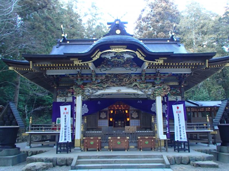 広い参道を足早に下って行くと宝登山神社です。絢爛な社です。
