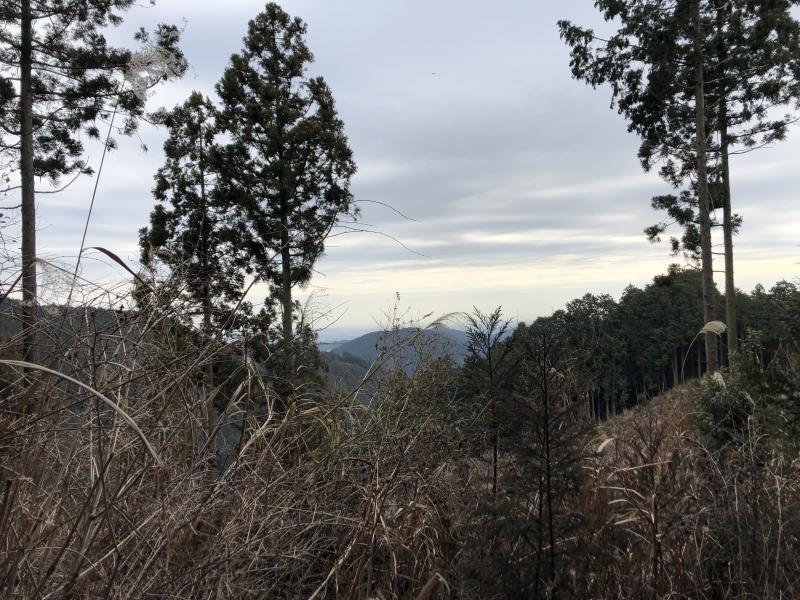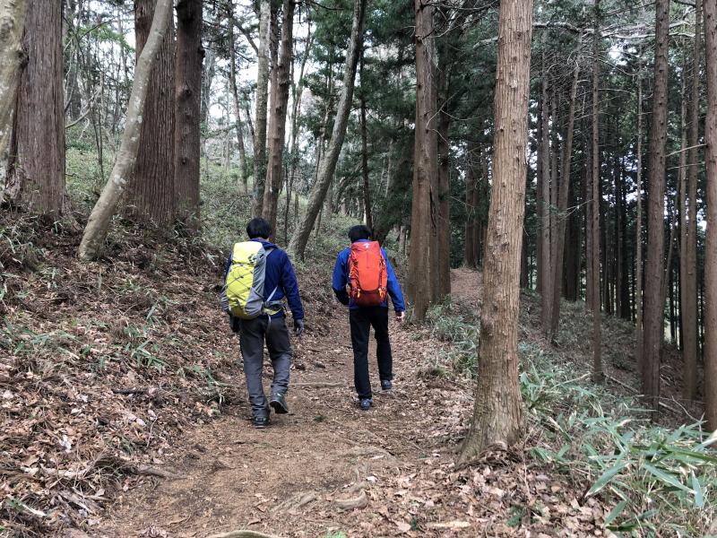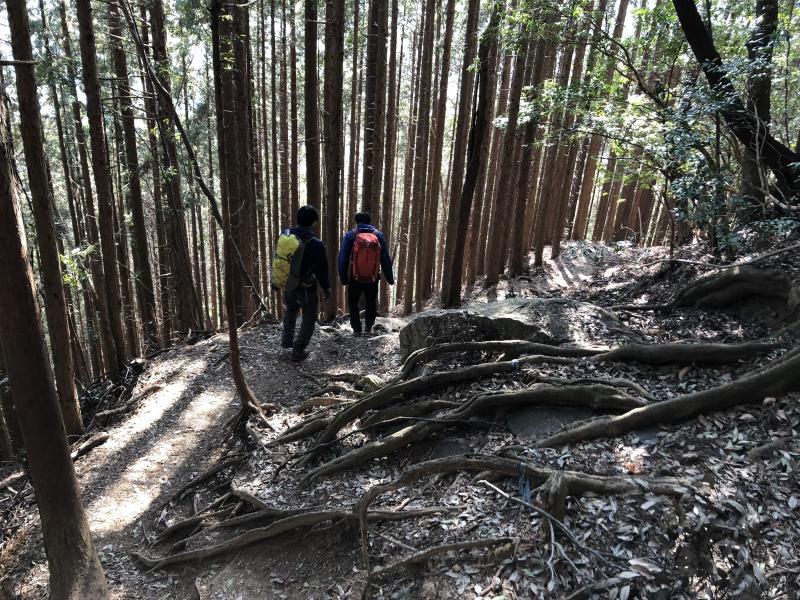 高水山を下り、杉の間を平行移動し、岩茸石山の上りが始まります。
