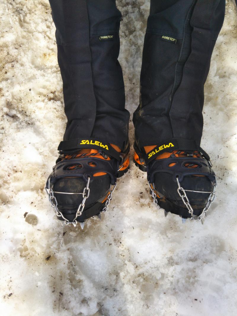 ぬかるんでいる箇所が多いのでスパッツ、今回は不要でしたが凍結に備えてアイゼンを持って行きましょう。