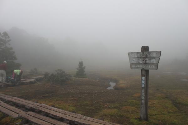 2日目。早朝5時前に出発。まだ真っ暗です。小屋の近くにある橋の上から空を見上げると、星がいっぱいで感動しました。昨夜、私が熟睡してる頃、何人かの方々は星を見に起き上ったそうです。「そういう楽しみ方もいいなぁ」と思いながら、花之江河へ。花之江河着く頃には明るくはなっていましたが、濃霧で先が見えにくい…(>_<)。天気が回復するように期待しつつ、どんどん先に進みます。雨も降っていないのに、道は濡れています。霧は濃くなる一方で、霧雨状態。岩場はすべるすべる。宮之浦山頂から見る景色も真っ白。とりあえず、ここで御飯を食べながら晴れるのを待つことに。「昼過ぎから晴れる」という情報を聞いていましたが、どうやら山頂は晴れないもよう。寒くなってきたので、いざ永田へ!この辺りで「永田へ行く」という単独のオバサマに、ご一緒させていただきました。いろいろ話を聞くと、前回、悪天候で道に迷ってしまったので、今回はリベンジの永田岳だそうです。