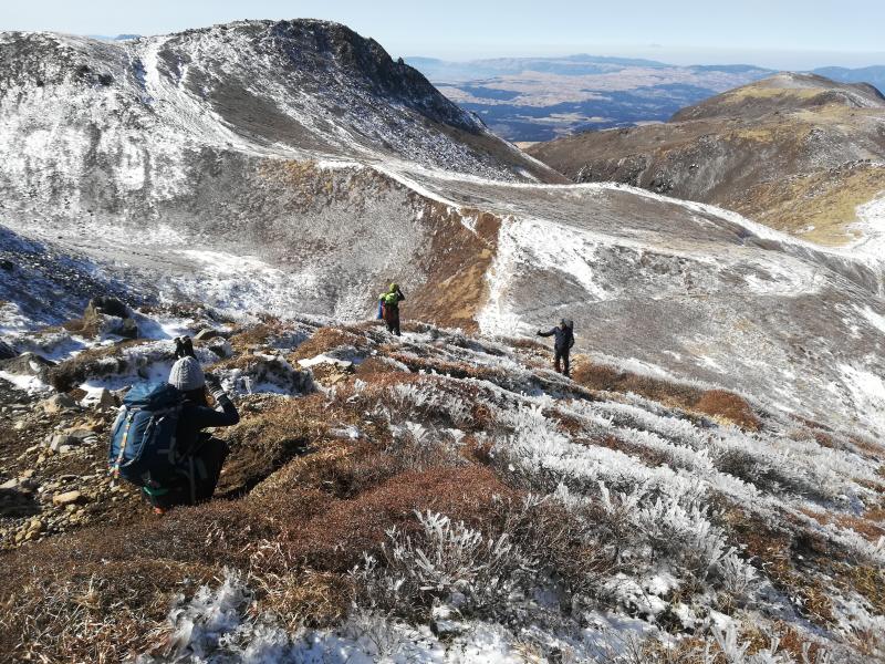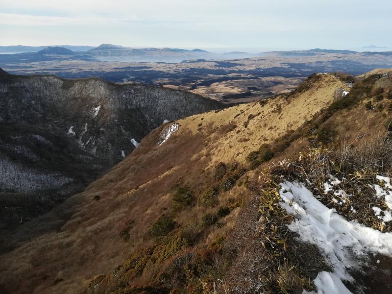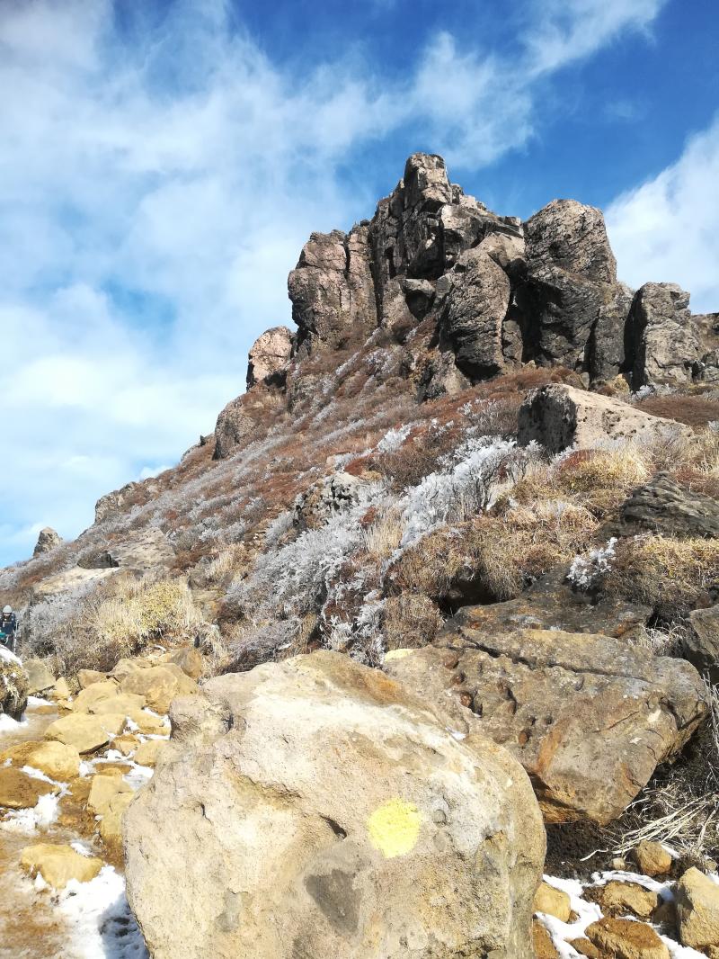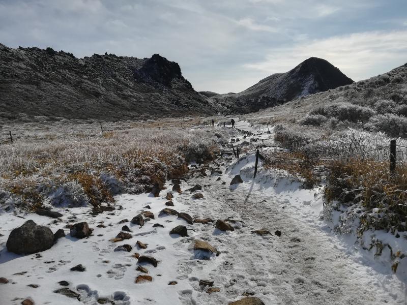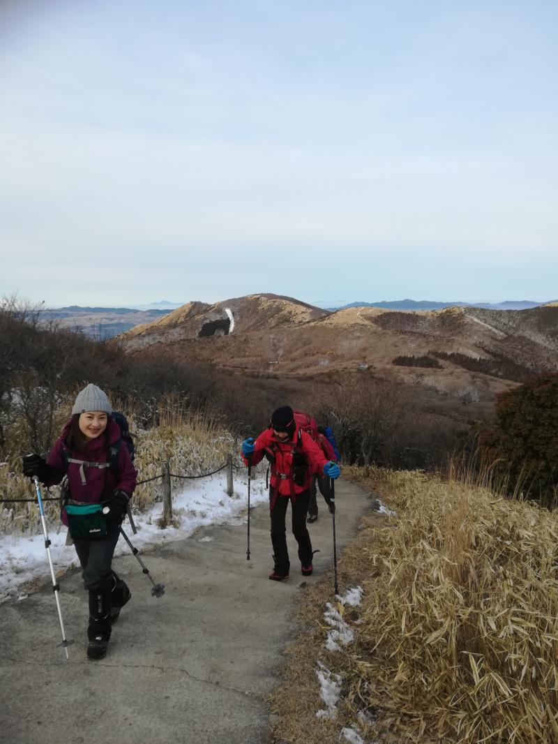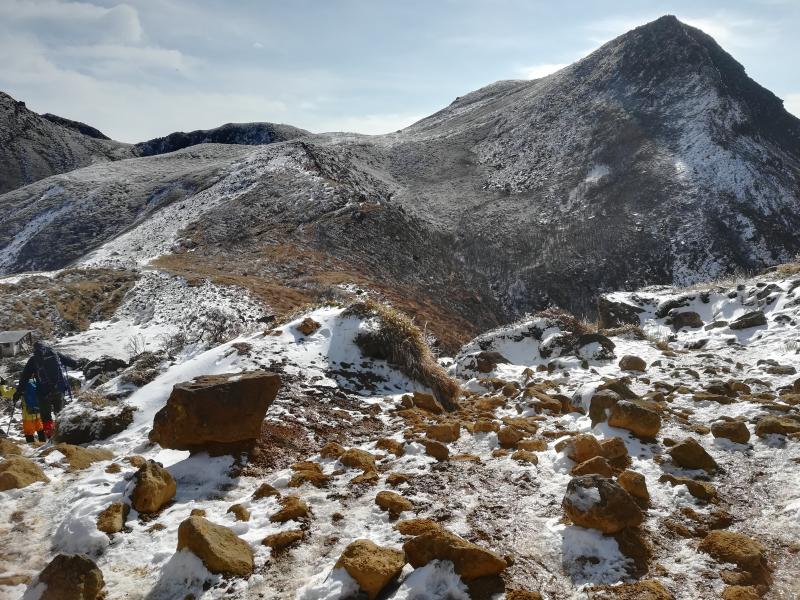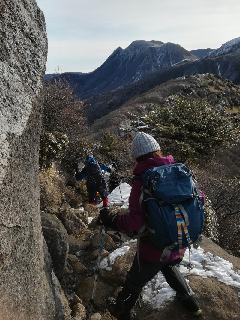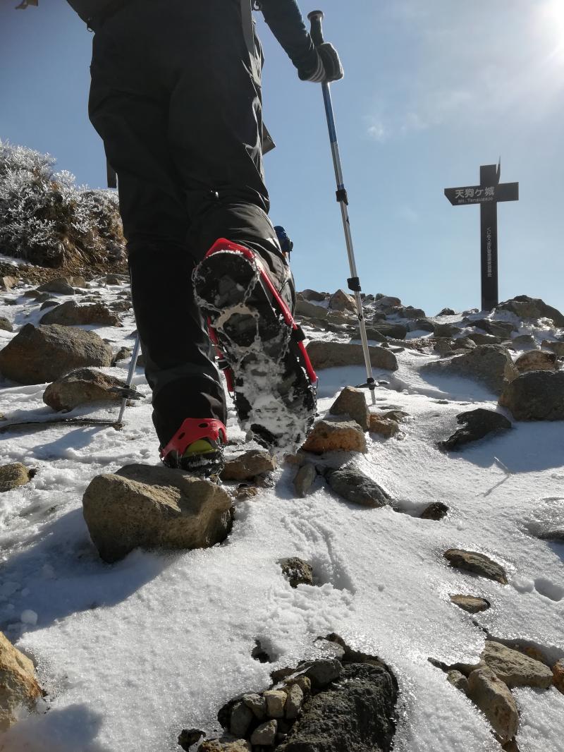 天狗ヶ城に向かう途中で滑りやすくなり、友人たちはチェーンアイゼンを装着して歩いていましたが、これが正解で、土と岩と氷の状況ではスイスイ歩けたそうです。久住登山ではおすすめです。