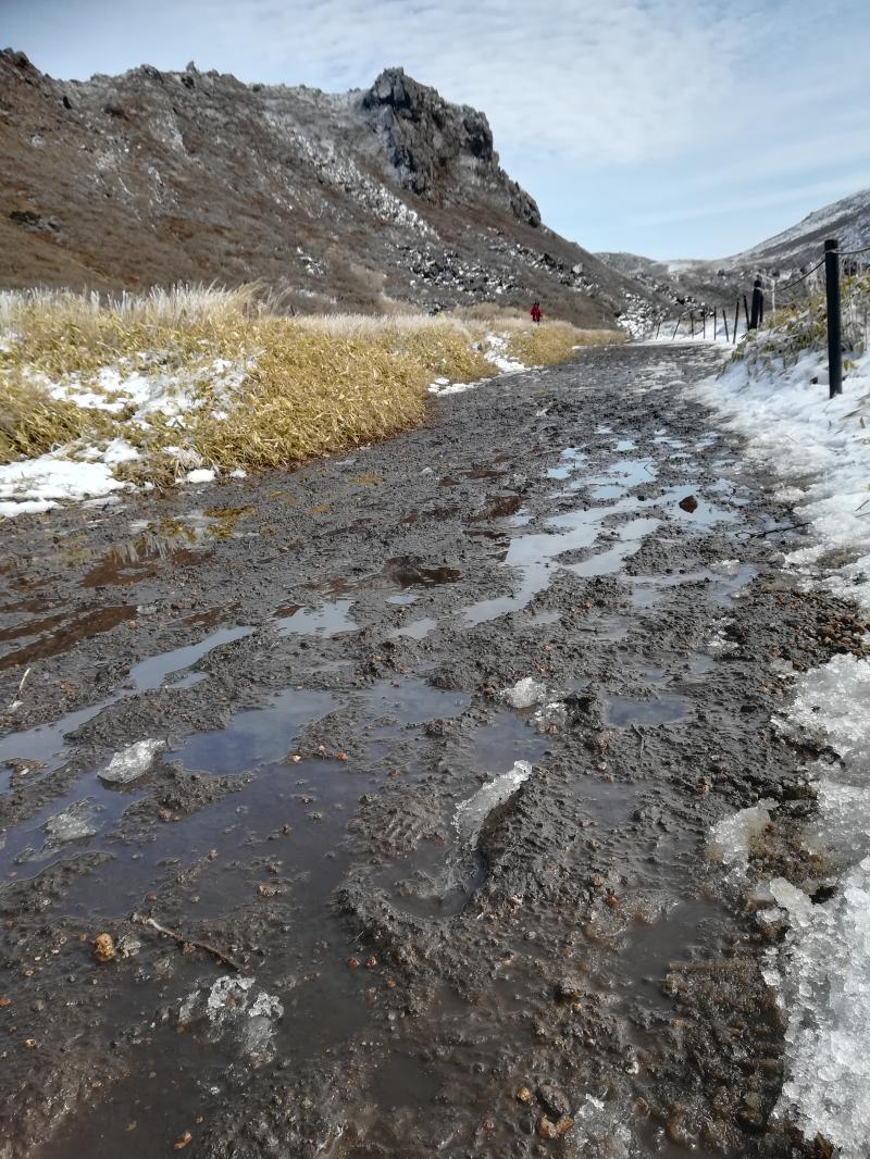 - 登りは凍結していましたが、下山時は雪や氷がとけてぬかるみ状態