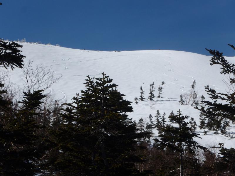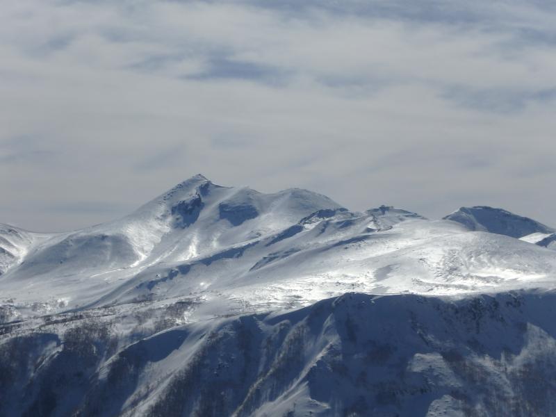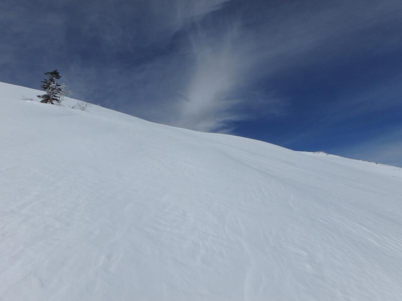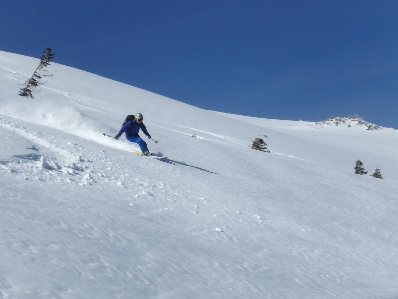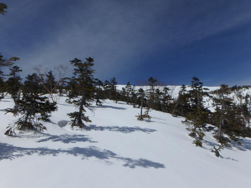 お楽しみのスキーは山頂直下の無木立斜面。ただし標高差は150mちょい。